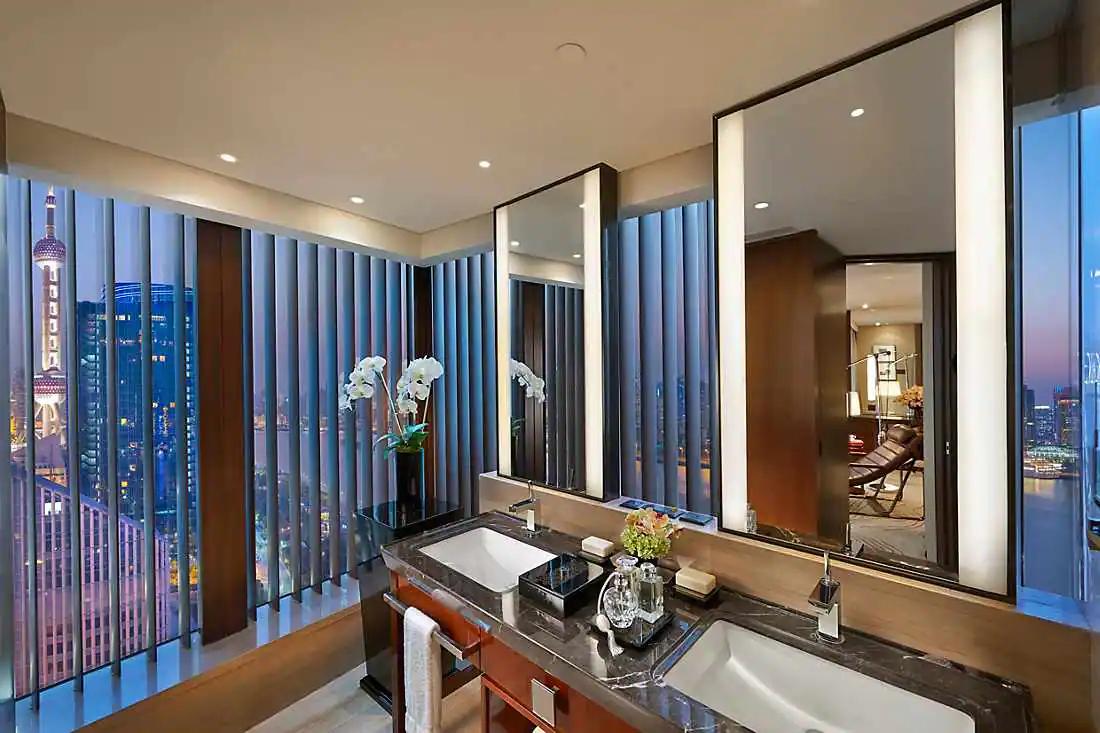 一間可透過兩面窗戶墻欣賞上海美景的單臥室套房。