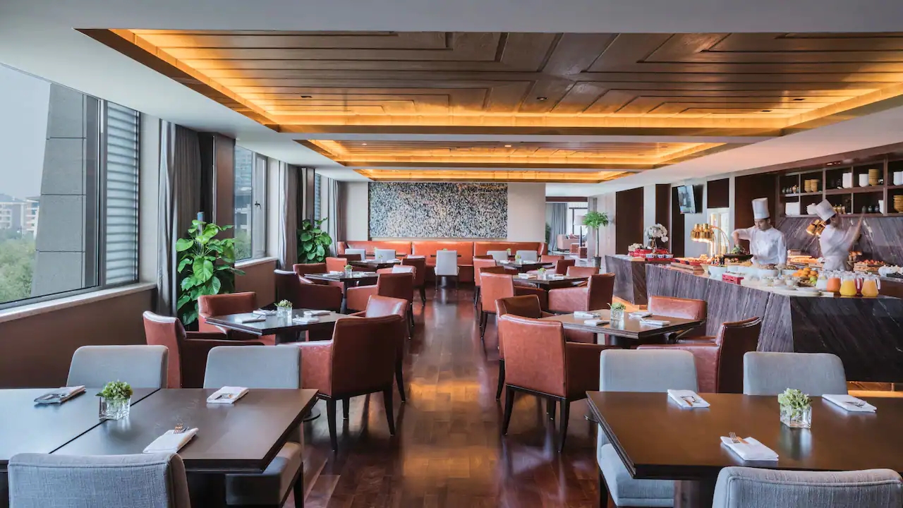 宏偉的中庭設(shè)計(jì)將餐廳分為三個(gè)主要用餐區(qū),均可欣賞曲江湖的壯麗景色。