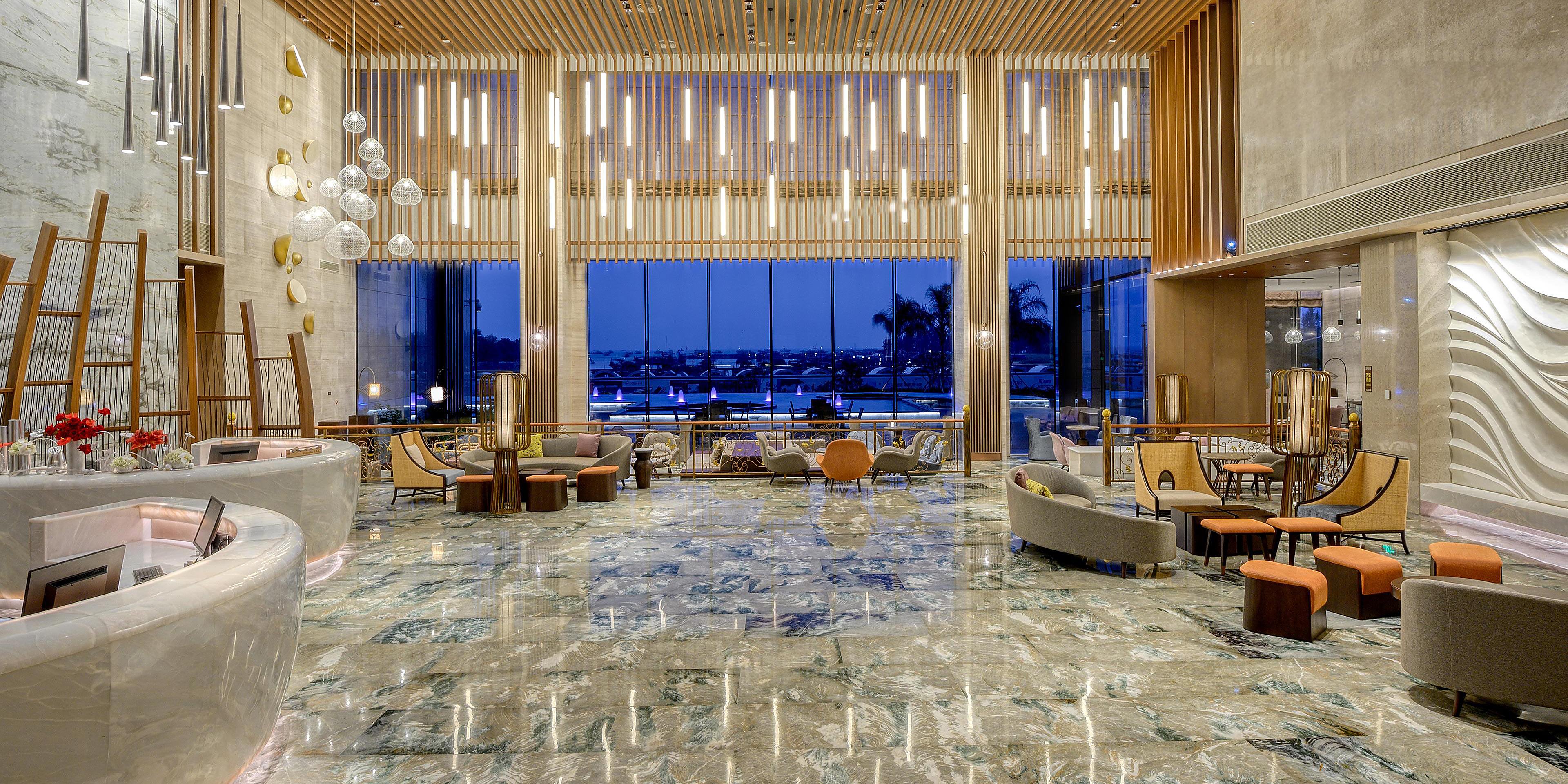 大堂酒廊寬敞明亮,舒適宜人,戶外區(qū)域擁有親水下沉式休閑平臺,四面碧水環(huán)繞,是小憩或洽談的理想場所。