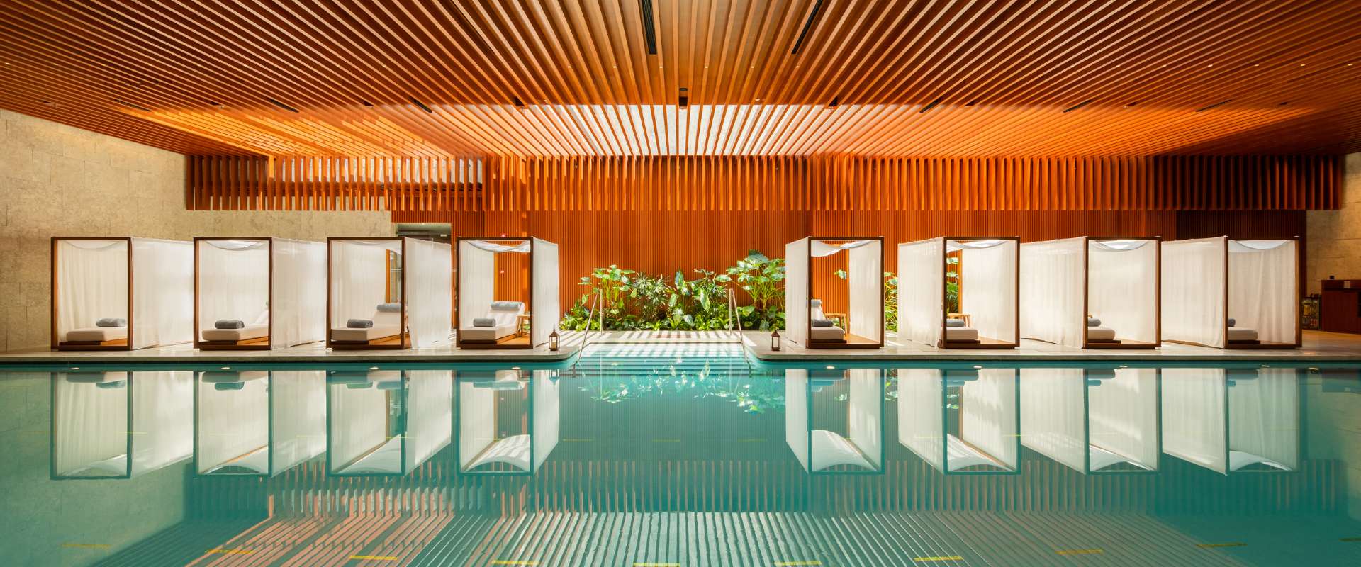 水療中心的核心是一個(gè)25米長(zhǎng)的室內(nèi)溫水游泳池,周?chē)h(huán)繞著雕像般的柱子,讓人回想起羅馬浴場(chǎng)的宏偉。