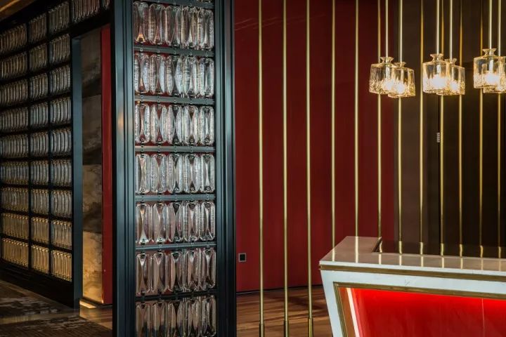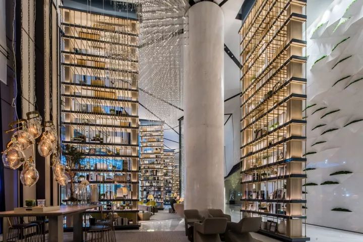 設(shè)計(jì)以空間場景的塑造為出發(fā)點(diǎn),不止于表面的裝飾,更多的運(yùn)用建筑的處理手法來劃分空間。使各空間相互滲透,營造出虛實(shí)穿插的視覺體驗(yàn)。如:大堂的建筑空間較為狹長,進(jìn)深較短。這樣的先天條件激發(fā)了我們在空間處理上的靈感。我們運(yùn)用精致的特殊玻璃結(jié)合水芯片的屏風(fēng)及層架劃分出空間的段落,使狹長的大堂區(qū)域營造出不同的空間場景。大堂另外一個(gè)引人注目的地方是植物墻,同樣是鉆石切割拼法的設(shè)計(jì),綠植錯(cuò)落有致地置于其上,如神來之筆,讓空間頓時(shí)有了活力和生機(jī)。大堂吧的設(shè)計(jì)延續(xù)了鉆石切割的處理手法,傾瀉而下的發(fā)光藝術(shù)裝置更是讓人眼前一亮。