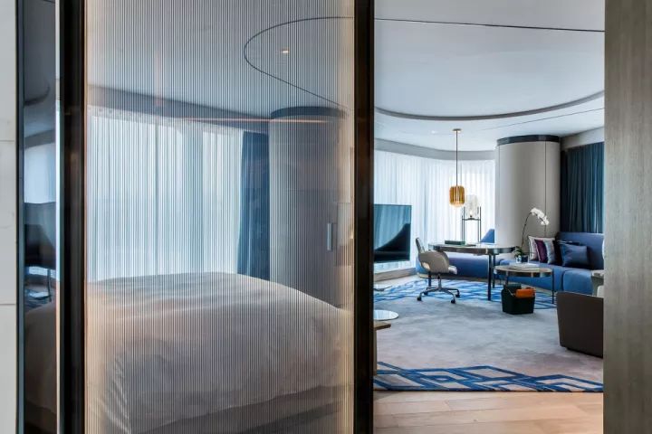 CCD 希望打造一個(gè)“新雅皮,New Yuppies”風(fēng)格的酒店。之所以說“新”是因?yàn)橐郧耙徽f到雅皮容易聯(lián)想到的是積極上進(jìn)、自信坦然、溫文爾雅、追求時(shí)尚生活,但色彩上卻往往只有黑白灰。而 CCD 為三里屯洲際打造的是新雅皮風(fēng)格:依然追求甚至引領(lǐng)時(shí)尚潮流,但是色調(diào)卻不是只有黑白灰,甚至用寶石藍(lán)作為主色調(diào),營造未來感兼科技感的前衛(wèi)氛圍。