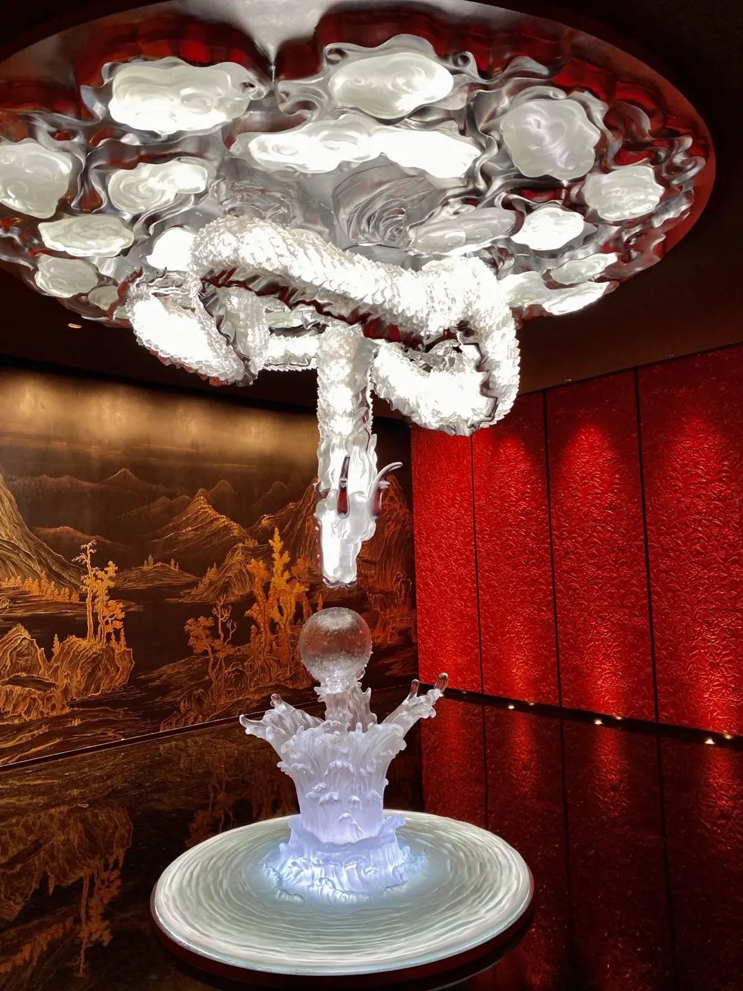 一尊造型頗具東方美的雕塑惹人注目,背景墻由紅色琉璃燒制而成的繁花雕紋,構成一條長廊,中國的傳統(tǒng)工藝之美盡顯。
