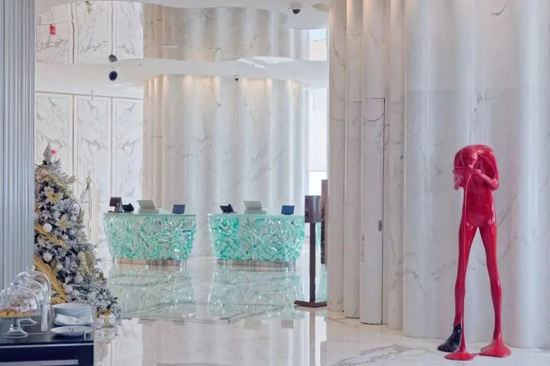J酒店內(nèi)陳設的1000多件藝術品均出自國內(nèi)外知名藝術家之手。三個錯落排列的立體水晶接待臺側(cè)面,是由法國藝術家Pauline用金屬絲手工精心編制的芭蕾舞者,優(yōu)雅動人的舞姿。