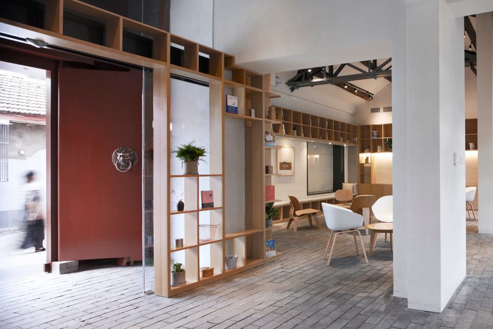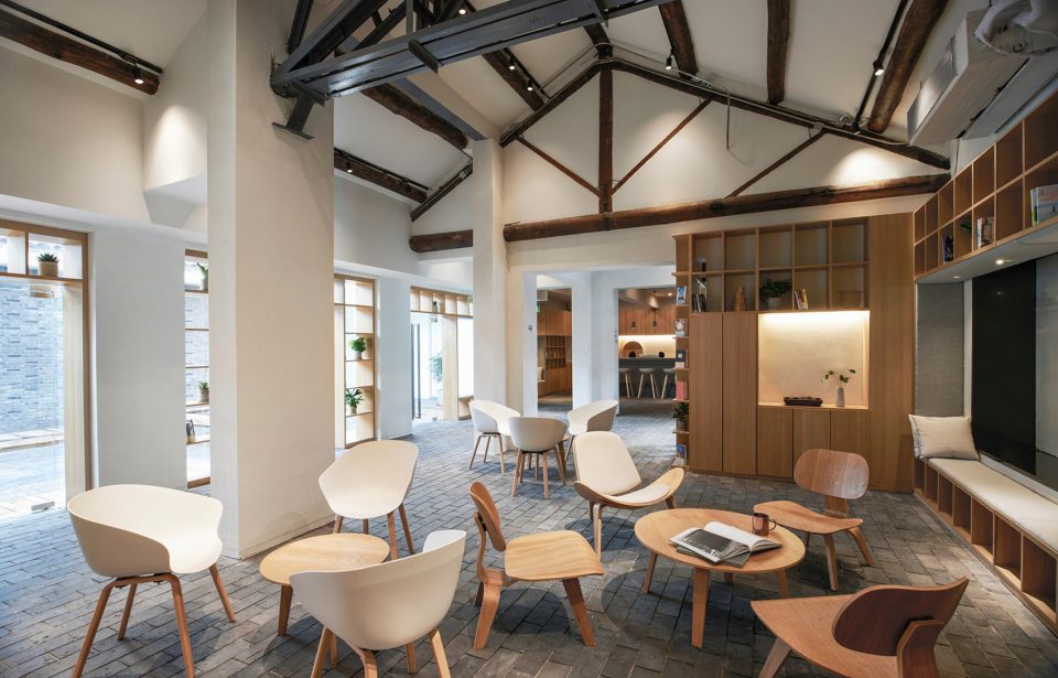 驛棧由兩間院子相連而成,從一面中式的朱紅色大門走進(jìn)院子,左側(cè)為前臺(tái),右側(cè)為室內(nèi)影音閱讀區(qū)。暮色時(shí)分,暖黃光影從玻璃磚映出,交錯(cuò)出現(xiàn)代感的光影矩陣。