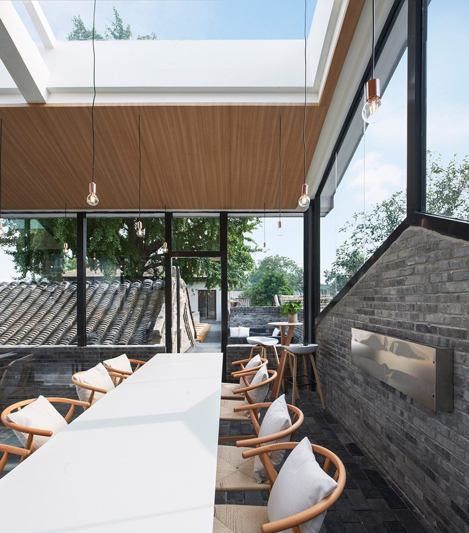 二層的露臺(tái)由一層廊道屋頂連通而成,形成坐于屋瓦之間、樹蔭之下的典型北京胡同文化體驗(yàn):夏聽蟬鳴,冬看白雪黛瓦。