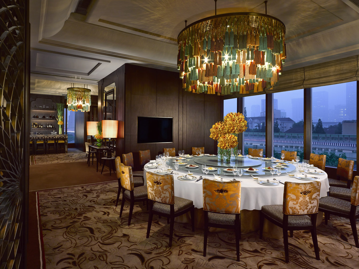 手工地毯以中國(guó)水彩畫(huà)為靈感,遍布包括客房在內(nèi)的酒店各處。每個(gè)區(qū)域皆獨(dú)一無(wú)二:大堂酒吧的河中蓮花,公共區(qū)域的現(xiàn)代水域各色魚(yú)群,大宴會(huì)廳的黃/橘色菊花,客房走廊的水彩花卉,以及客房?jī)?nèi)的現(xiàn)代畫(huà)圖案等,風(fēng)格不一。