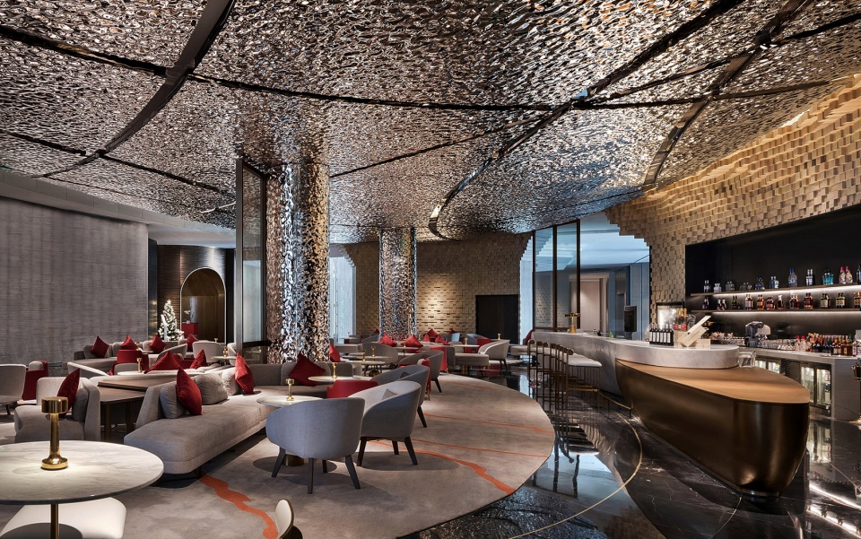 南京古城墻肌理被提取,化身大堂吧隔斷金屬結(jié)構(gòu),通透的設(shè)計(jì)使空間半隱半現(xiàn),既增強(qiáng)與大堂的聯(lián)動(dòng)性,又保證大堂吧的獨(dú)立性,將千年古都文化轉(zhuǎn)譯得更為時(shí)尚輕盈。