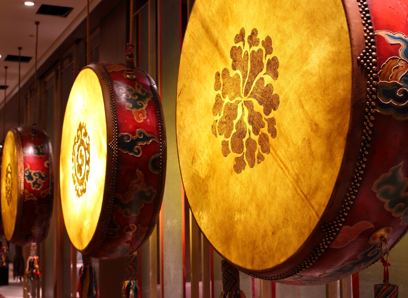 旅者酒廊被透明玻璃幕墻環(huán)繞,曼妙的水晶吊燈點亮整個空間,紅色織物與青銅細節(jié)以別樣符號詮釋西藏經(jīng)幡元素。