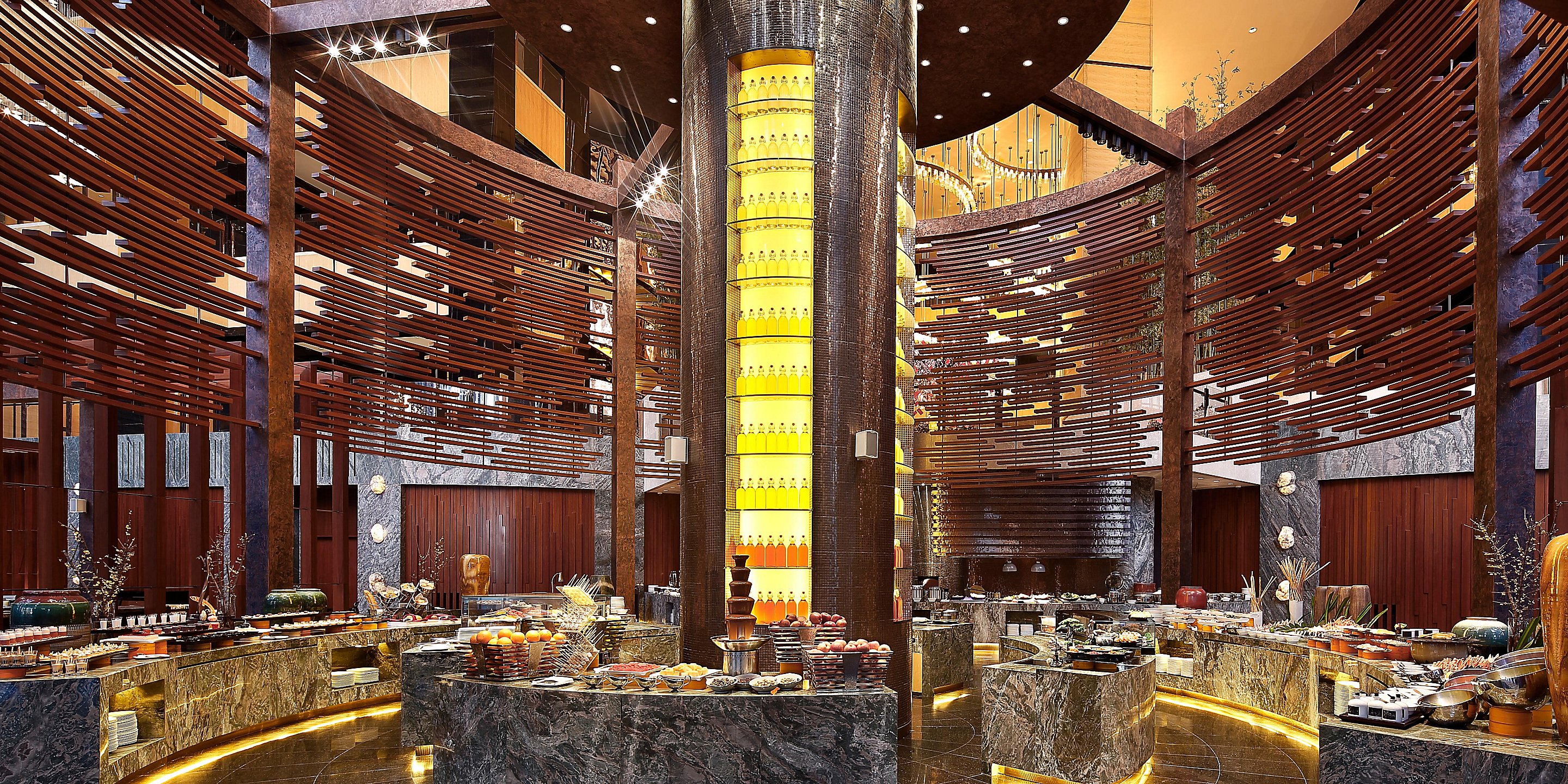 元素西餐廳位于酒店—層,屋頂挑高21米,寬敞明亮的空間,令人心曠神怡。