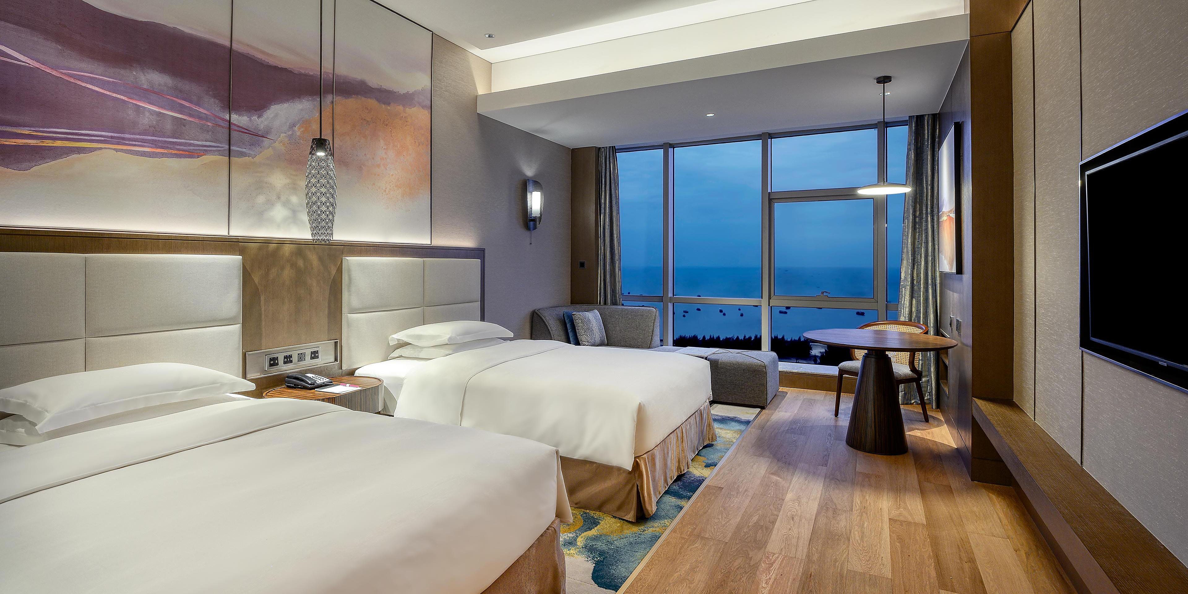 酒店的所有客房設(shè)備齊全,無線WIFI全面覆蓋,每個房間都擁有獨立的衛(wèi)浴間,落地窗的設(shè)計可以更好的將酒店周邊的美景一覽無余。
