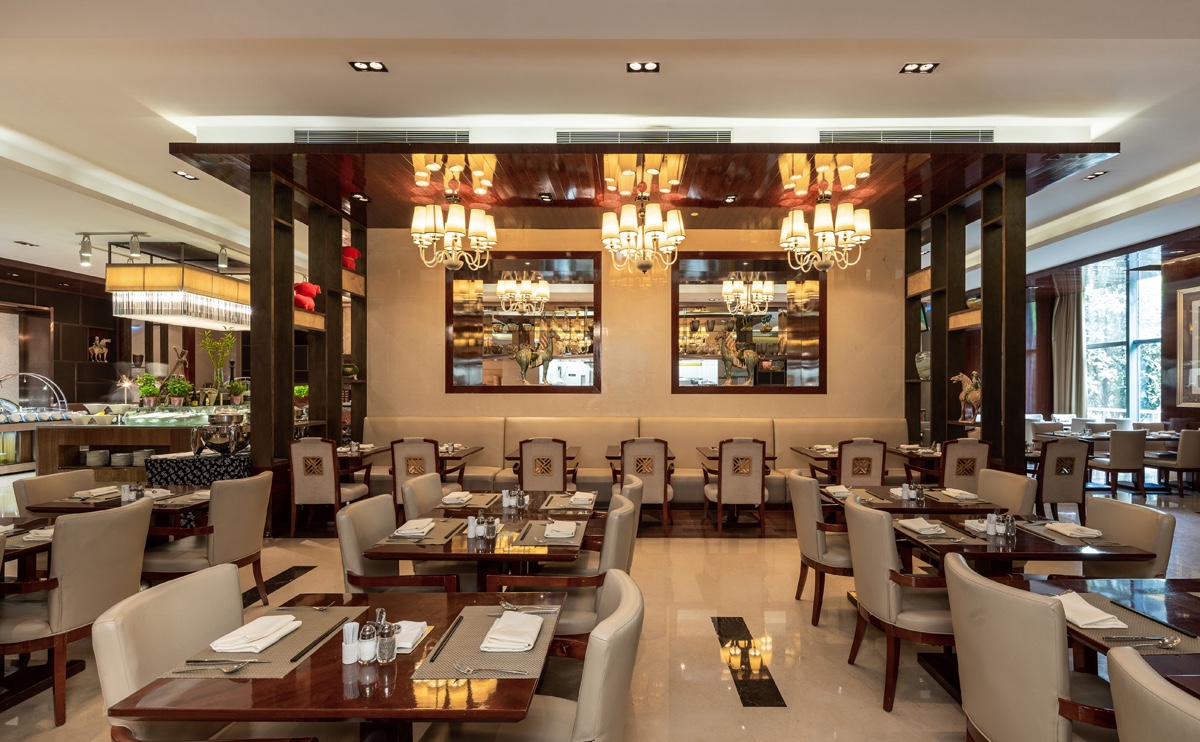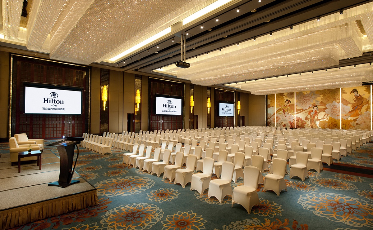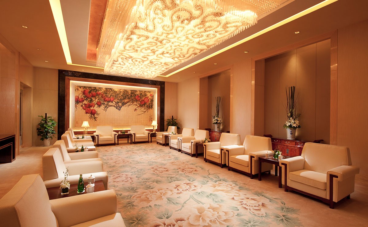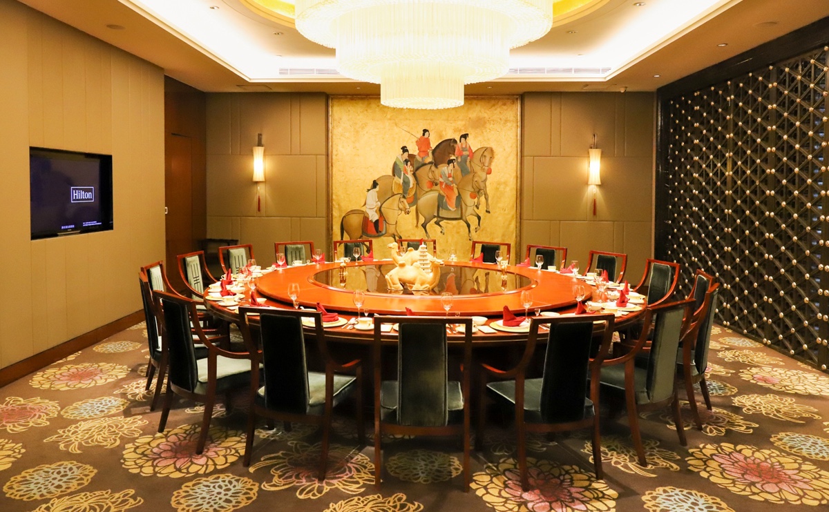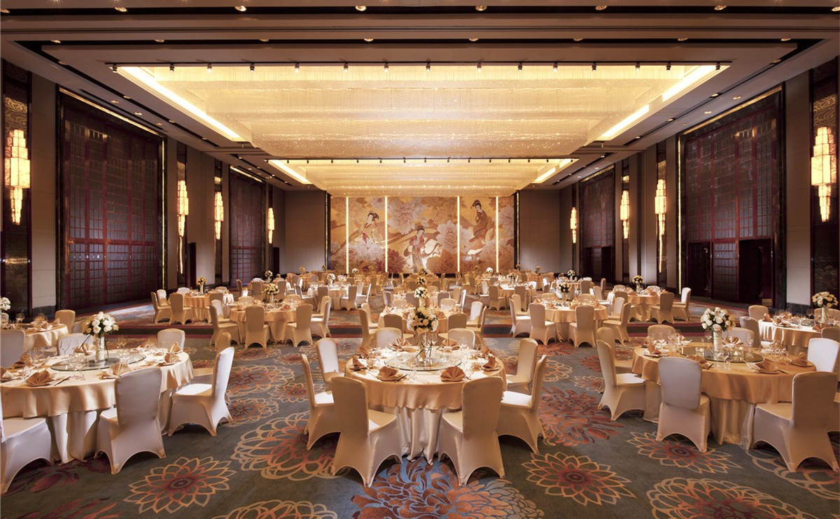 酒店共包含一間1,200平米的無(wú)柱大宴會(huì)廳 – 華夏廳,及六間多功能廳面積自76平米至190平米不等,滿足客人不同擺臺(tái)需求和活動(dòng)場(chǎng)地。整個(gè)宴會(huì)區(qū)域由整幅唐代《簪花仁女圖》構(gòu)成。畫中貴婦身披薄質(zhì)輕紗,內(nèi)著團(tuán)花長(zhǎng)裙,體態(tài)豐腴端莊,雍容華貴。