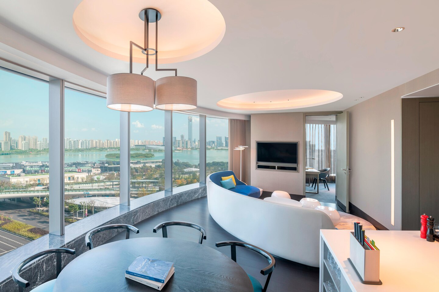 豪華酒店客房以當(dāng)?shù)馗鑴『图揖邽閱l(fā),采用充滿活力的色調(diào)搭配,同時配備 W 特色睡床、衛(wèi)浴用品、高速 Wi-Fi 和寬大的辦公區(qū),更可飽覽金雞湖美景和蘇州城市景致。