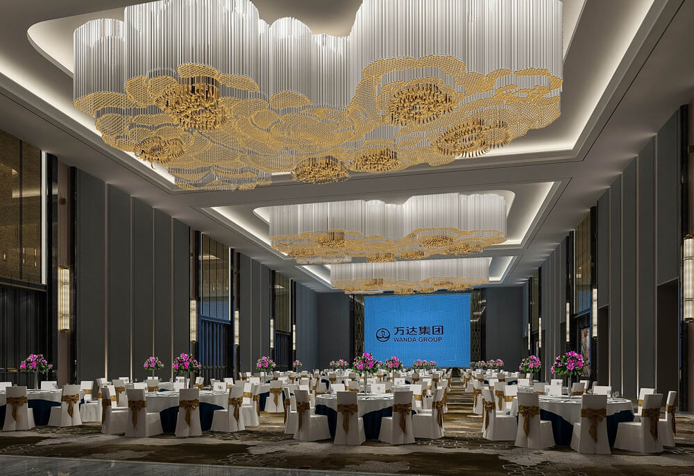 一個(gè)面積為958平方米的無(wú)柱式大宴會(huì)廳和配備90平方米高清LED顯示器載車(chē)電梯。