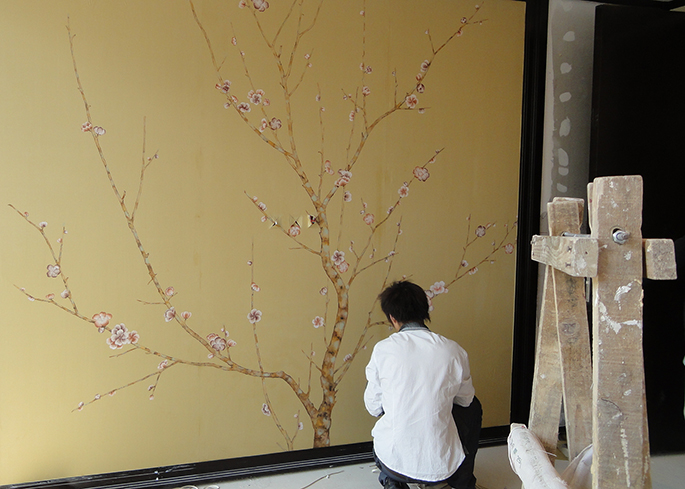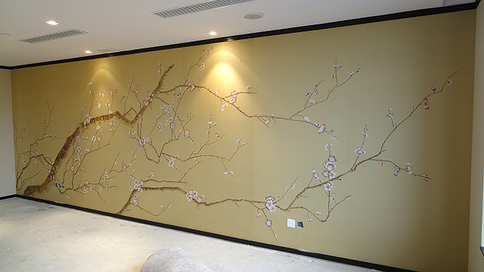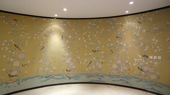 51A設計機構(gòu)2011年承接的北京奧克伍德華庭公寓式酒店中餐廳包間的手繪壁紙設計及制作,具體制作加工細節(jié)如下。