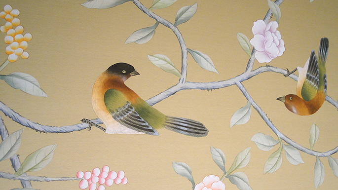 中式手繪墻紙繪畫的風格偏向于傳統(tǒng)工筆繪畫,兼帶現(xiàn)代繪畫的技法。典型的中式風格的手繪墻紙畫疏密對比強烈,虛實關(guān)系明顯,構(gòu)圖多采用近濃遠淡,近實遠虛的技法,來分清前后關(guān)系層層推遠畫面。繪畫技法也是多運用層層疊加的方式讓畫面色彩豐富渾厚華滋。