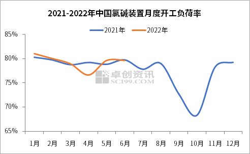 2022年上半年中國氯堿裝置平均開工負(fù)荷率為79.28%,相較2021年上半年的79.39%下降了0.11個(gè)百分點(diǎn),其中3-4月開工負(fù)荷率逐漸下降至低位,與2021年同期走勢相反。今年上半年3-4月多地運(yùn)輸效率下降,氯堿企業(yè)階段性出貨不佳,且部分氯堿企業(yè)春季例行檢修,開工負(fù)荷率相較去年同期有所下降,液堿供應(yīng)局部時(shí)間偏緊,推動液堿價(jià)格進(jìn)一步上漲。