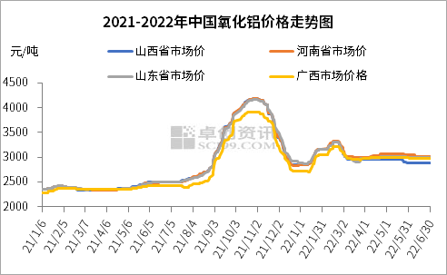 從上圖可以看出,2022年上半年中國氧化鋁價(jià)格較2021年上半年同期價(jià)格偏高,持續(xù)偏高位運(yùn)行。以山東市場為例,2022年上半年山東氧化鋁均價(jià)為3025.77元/噸,較去年同期2397.23元/噸上漲26.22%,漲幅明顯。氧化鋁價(jià)格的持續(xù)高位使得氧化鋁生產(chǎn)企業(yè)對于成本端的控制并不十分嚴(yán)格,對高位燒堿價(jià)格接受程度較好。