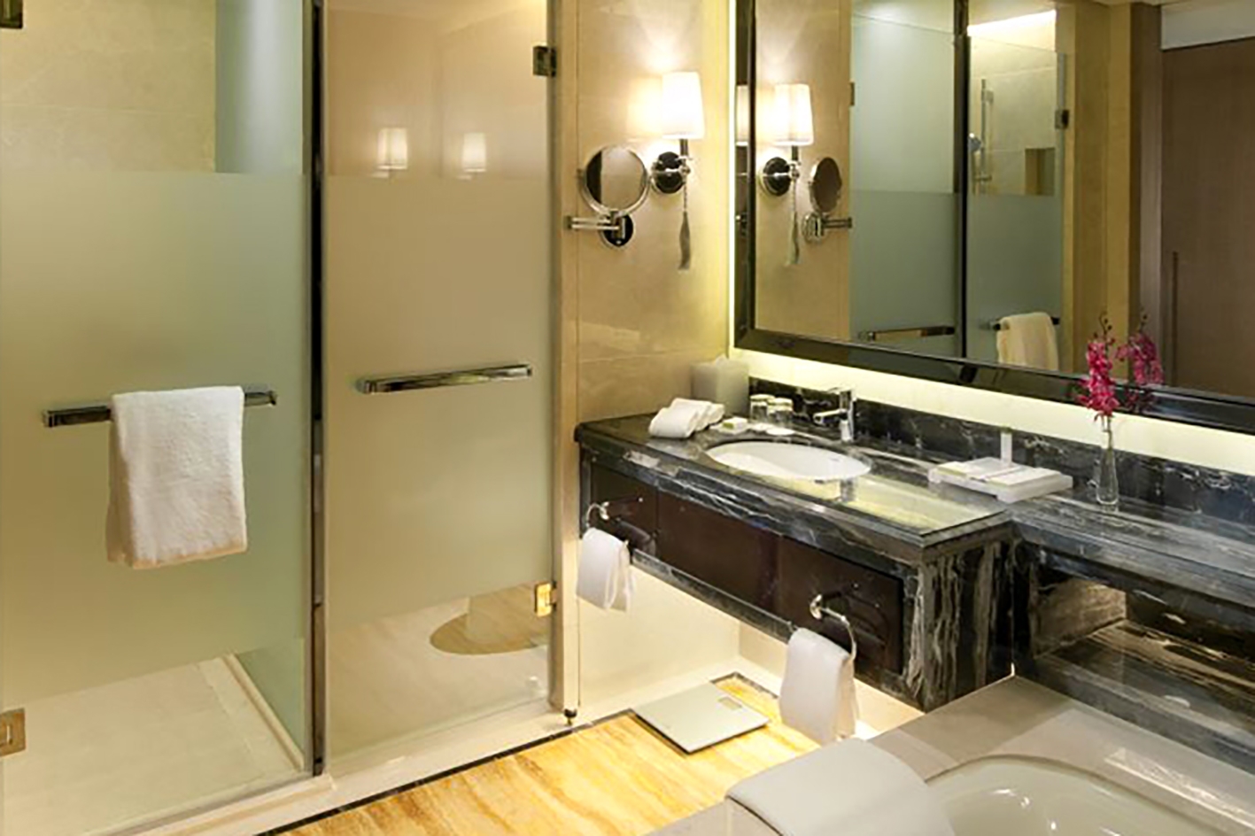 衛(wèi)生間干、濕功能分區(qū)完整而實(shí)用,步入式淋浴間為賓客帶走倦意。