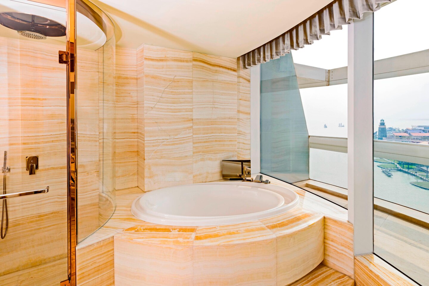 所有客房均提供大型私人陽臺(tái)以及配備獨(dú)立浸泡式浴缸的大理石浴室。