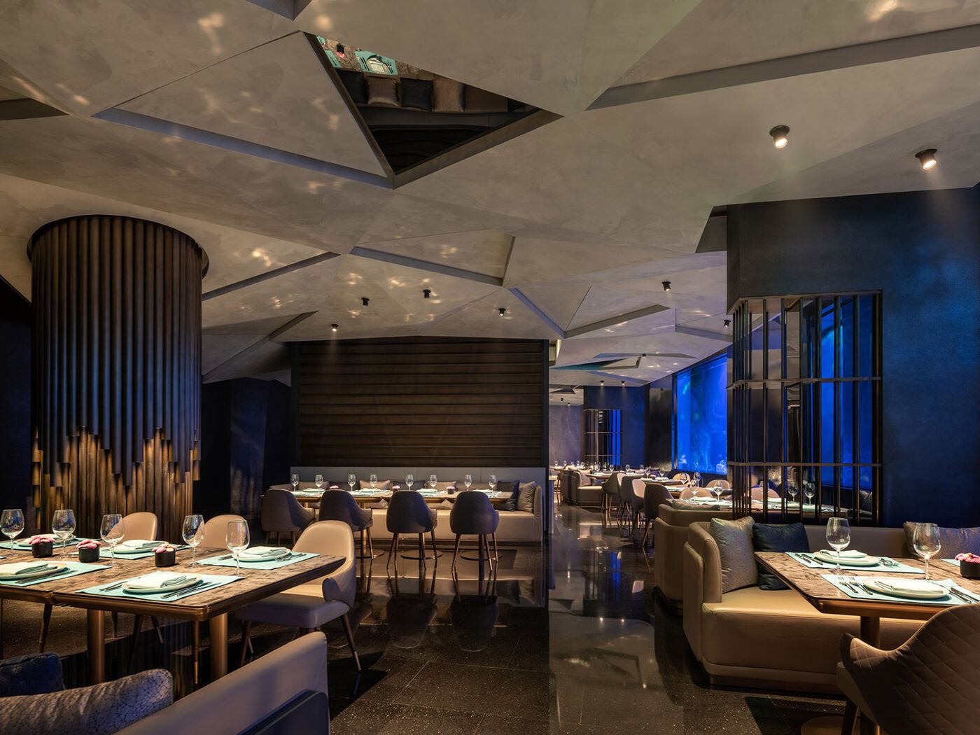 探險家們像尋寶般地發(fā)現(xiàn)奇跡,發(fā)現(xiàn)流水沿石灰?guī)r層面裂隙溶蝕、侵蝕而形成水簾洞。水下餐廳的天花造型與反射就像暗藏著連生晶體,炫彩斑斕,映射出和空間環(huán)境共鳴的美感。觀望著水里的魚群,點著蠟燭,在這里享受特別的用餐體驗。