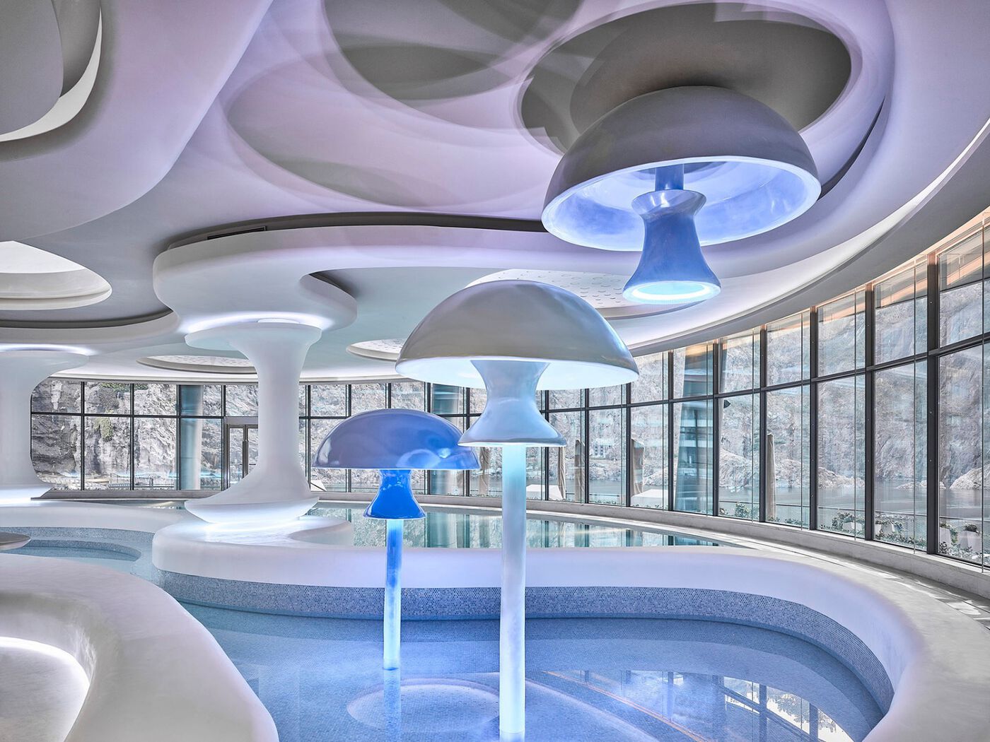 透過泳池的玻璃幕墻,可以感受到室外雄偉的深坑崖壁,泳池內(nèi)部運用人造石打造類似于蘑菇泡泡的趣味性裝飾元素。