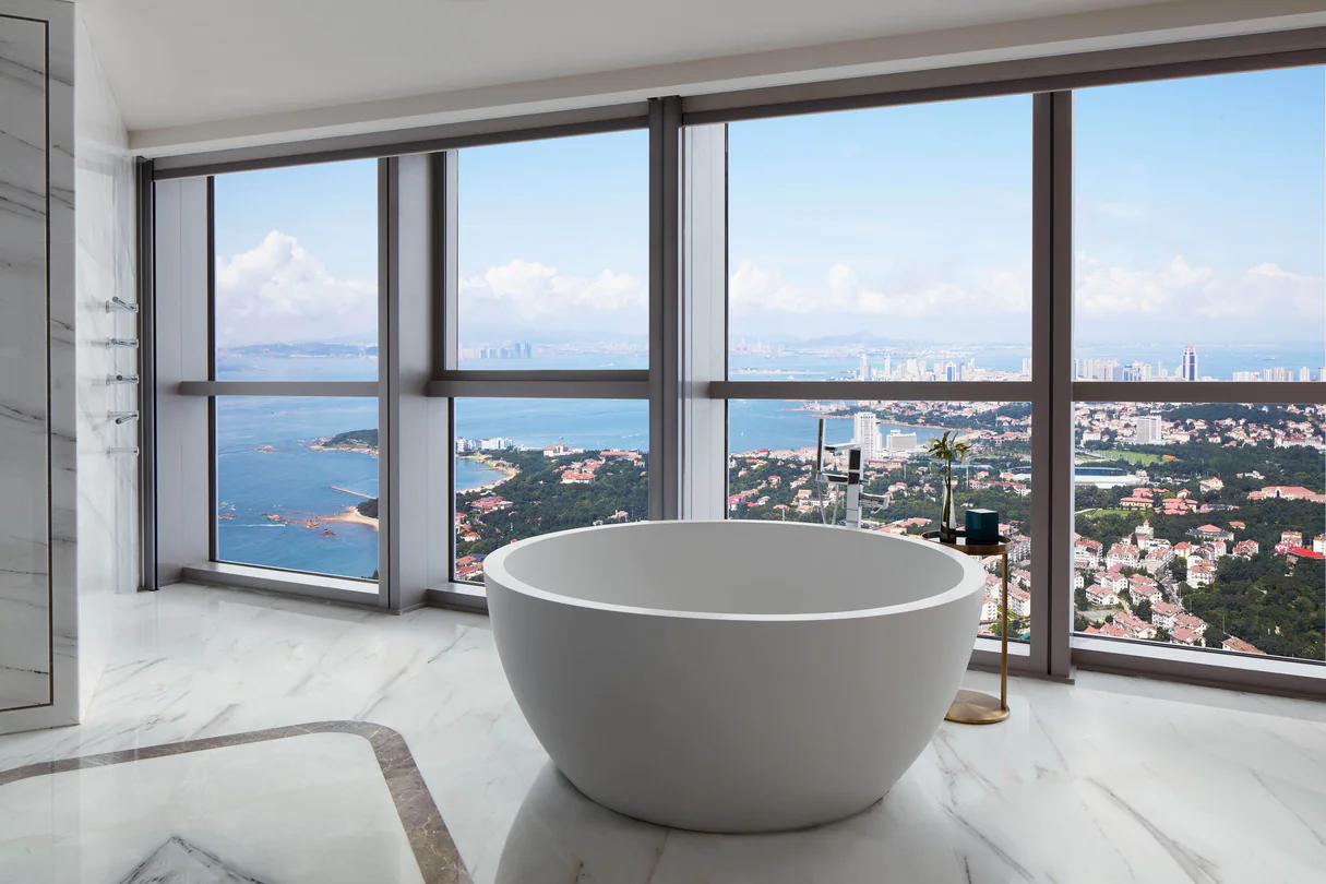 客房還設(shè)有大落地景觀玻璃窗,讓你可俯瞰青島全城,亦可欣賞浩瀚的黃海。