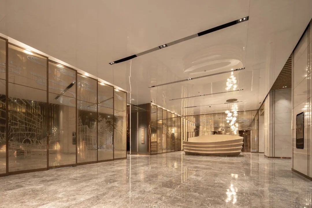 接待臺(tái)面延續(xù)航行船只的造型,加設(shè)弧形燈光裝置,以上下呼應(yīng)的手法演化江中游行時(shí)水面呈現(xiàn)的倒影景觀,形塑航行意象。在燈光與自然光線的映射下,空間形成內(nèi)外景色的貫通,伴隨行走動(dòng)線,場(chǎng)景的畫(huà)面內(nèi)涵由遠(yuǎn)及近不斷顯現(xiàn),讓人感受到開(kāi)闊的格局中越發(fā)清晰的認(rèn)知印象。