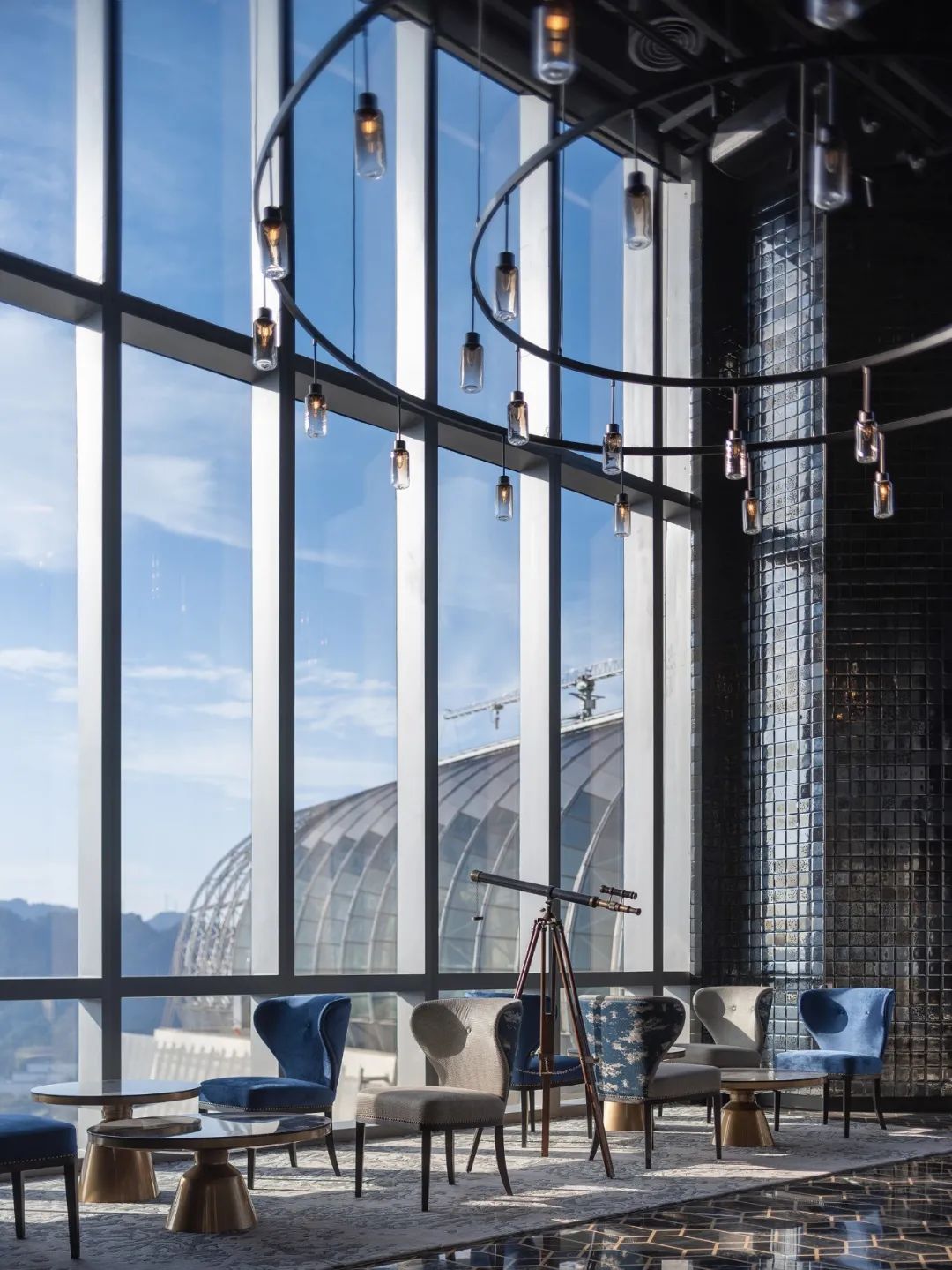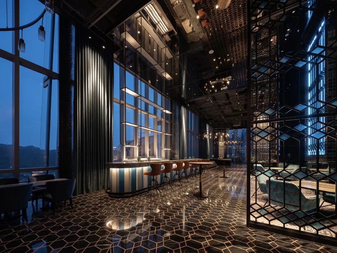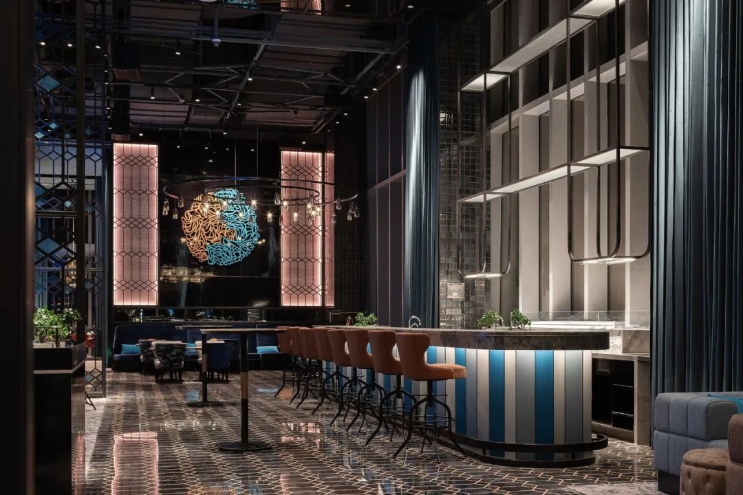 宴會(huì)廳將兩江交匯的顏色提煉為設(shè)計(jì)靈感,以藍(lán)色和金色延展天空和城市景觀,波浪形頂部與窗外波光粼粼的江面遙相呼應(yīng),開(kāi)闊的場(chǎng)景氛圍升華客人的感官體驗(yàn)。