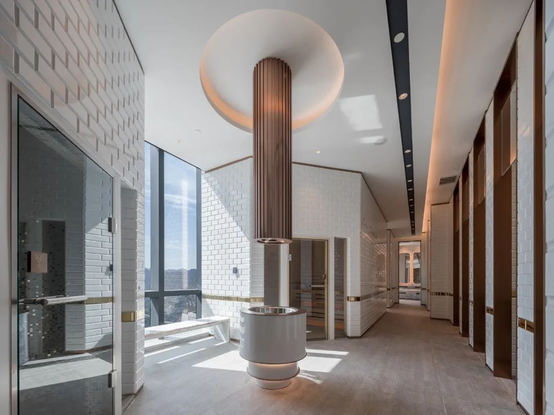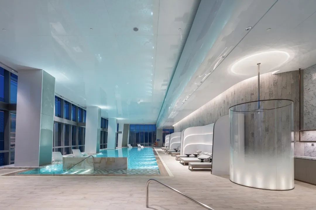 除酒店區(qū)域之外,CL3與Safdie Architects還共同設(shè)計(jì)了住宅區(qū)大堂,以及42層水晶連廊內(nèi)的住宅區(qū)俱樂(lè)部等。俱樂(lè)部與主泳池回歸城市生活的律動(dòng),時(shí)尚的造型語(yǔ)言和輕盈的色彩激發(fā)身體內(nèi)的運(yùn)動(dòng)能量和社交細(xì)胞。