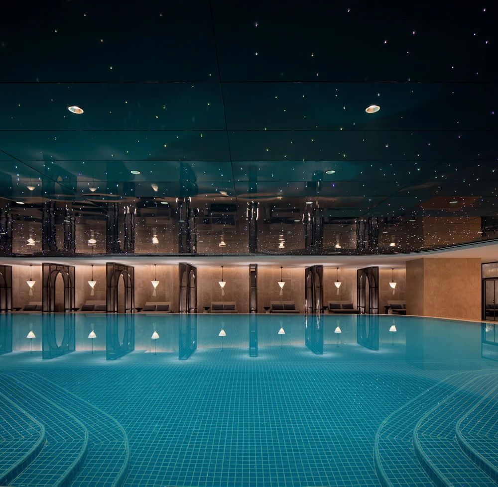 康體中心的游泳,選用鏡面材質(zhì)的天花,與水面相互掩映,閃耀在燈光,宛若星河浩渺。錯(cuò)落有致的天花結(jié)構(gòu),避免了層高較矮的空間局限,也帶來(lái)碧空云海的視覺(jué)震撼。