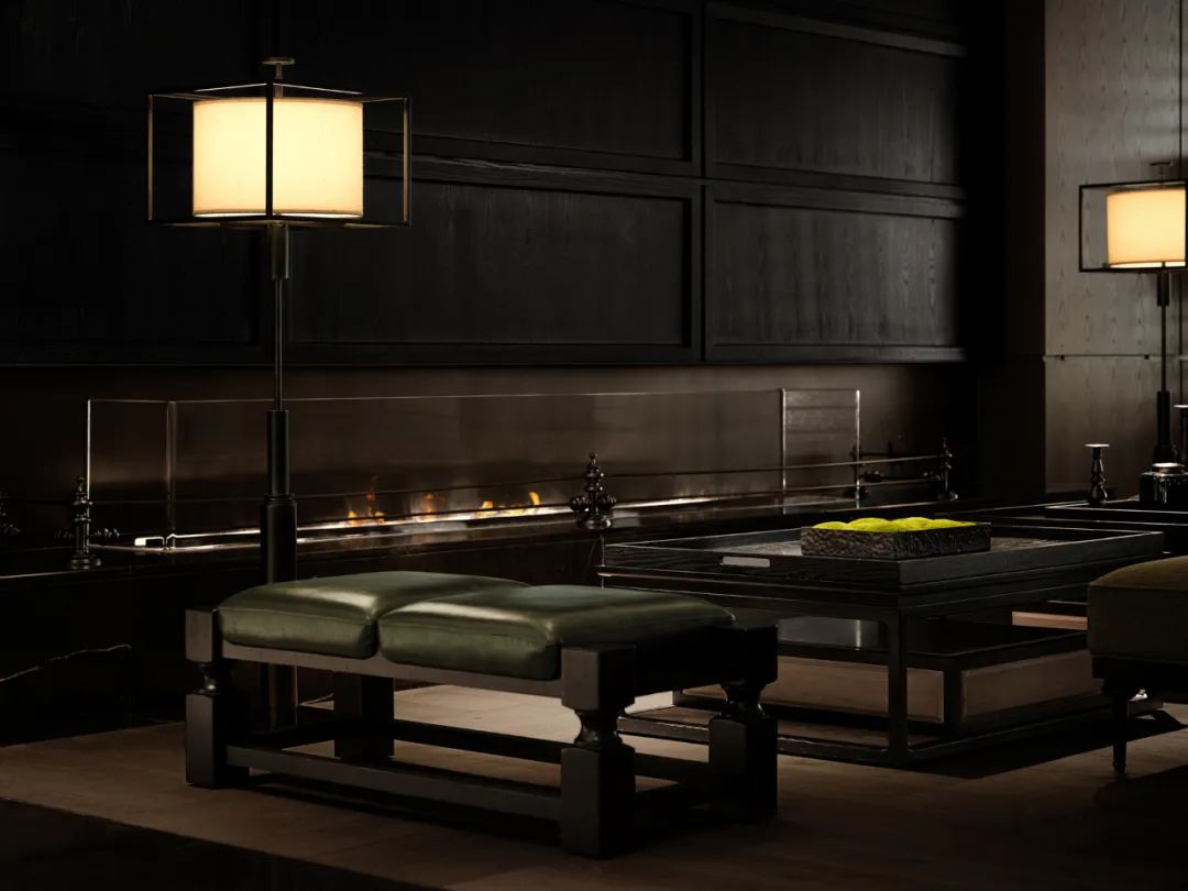 高而聳的直立挺拔門(mén)廳,結(jié)合到天然雲(yún)石的吊燈,更是突出了入口區(qū)域的儀式感和尊貴感。跳動(dòng)的爐火也代表著家的熱度,在寒冷的時(shí)候,永遠(yuǎn)有著溫暖的等候。大堂頂部天花將中國(guó)建筑斗拱的形式藝術(shù)化表達(dá),層疊有序,莊重肅穆。