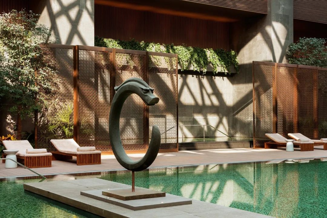 縱觀中國歷史,花園向來是遠離城市喧囂的好去處。向這一傳統(tǒng)致敬,北京瑰麗以隱居之所為靈感,用三米高的石墻和階梯式景觀環(huán)繞著酒店入口,被喚作龍之子的“椒圖”青銅雕塑作為守護神,平衡且對稱,將酒店與喧囂的城市隔絕開來??腿说诌_酒店后,穿過兩個氣勢恢弘的門神,可以進入一個內(nèi)部庭院和郁郁蔥蔥的花園。