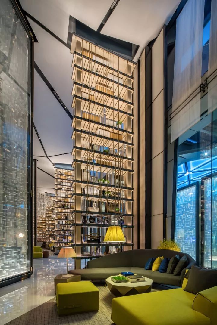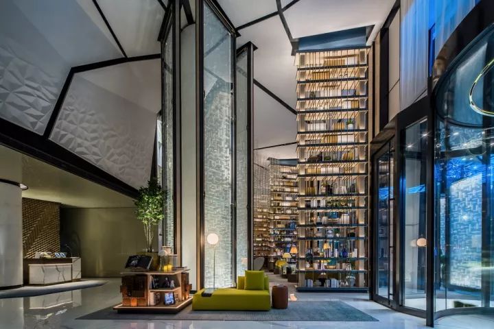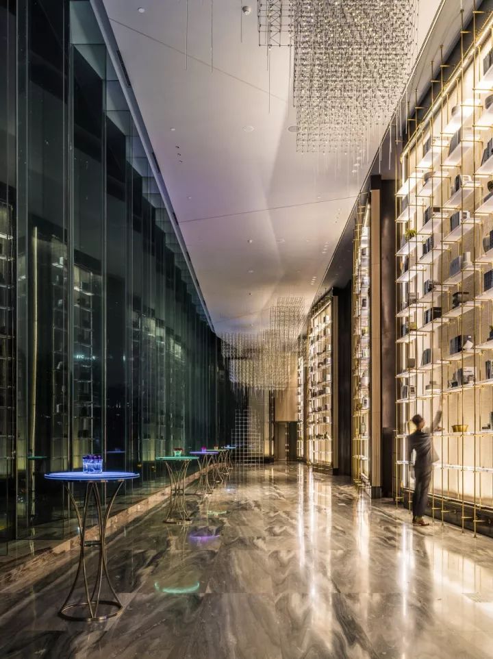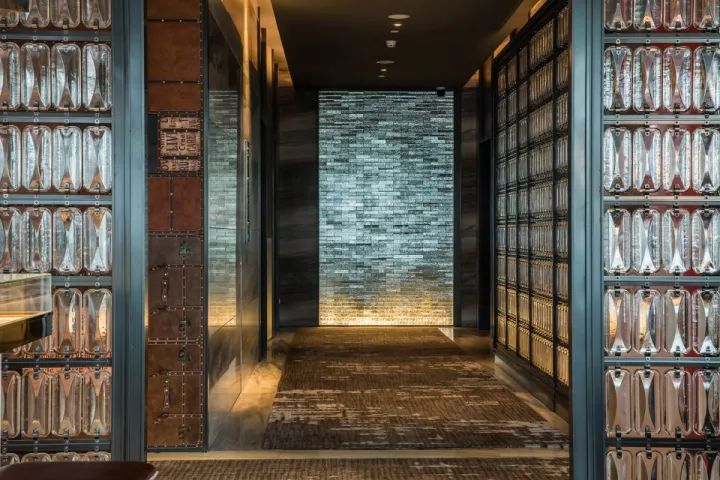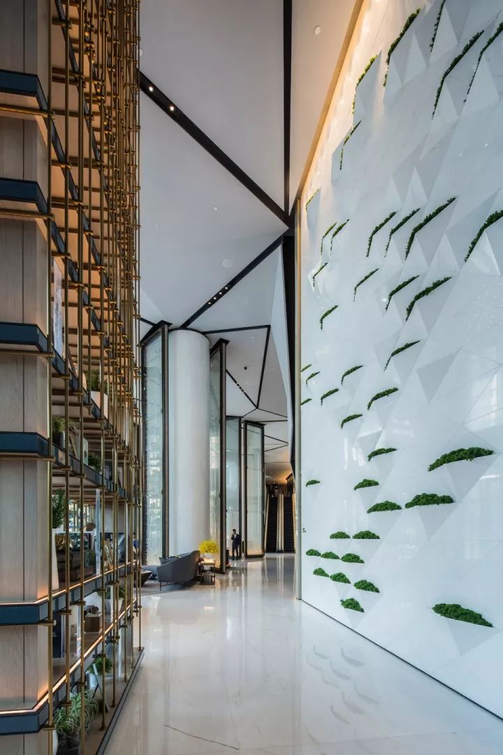 設(shè)計(jì)以空間場景的塑造為出發(fā)點(diǎn),不止于表面的裝飾,更多的運(yùn)用建筑的處理手法來劃分空間。使各空間相互滲透,營造出虛實(shí)穿插的視覺體驗(yàn)。如:大堂的建筑空間較為狹長,進(jìn)深較短。這樣的先天條件激發(fā)了我們在空間處理上的靈感。我們運(yùn)用精致的特殊玻璃結(jié)合水芯片的屏風(fēng)及層架劃分出空間的段落,使狹長的大堂區(qū)域營造出不同的空間場景。大堂另外一個(gè)引人注目的地方是植物墻,同樣是鉆石切割拼法的設(shè)計(jì),綠植錯(cuò)落有致地置于其上,如神來之筆,讓空間頓時(shí)有了活力和生機(jī)。大堂吧的設(shè)計(jì)延續(xù)了鉆石切割的處理手法,傾瀉而下的發(fā)光藝術(shù)裝置更是讓人眼前一亮。