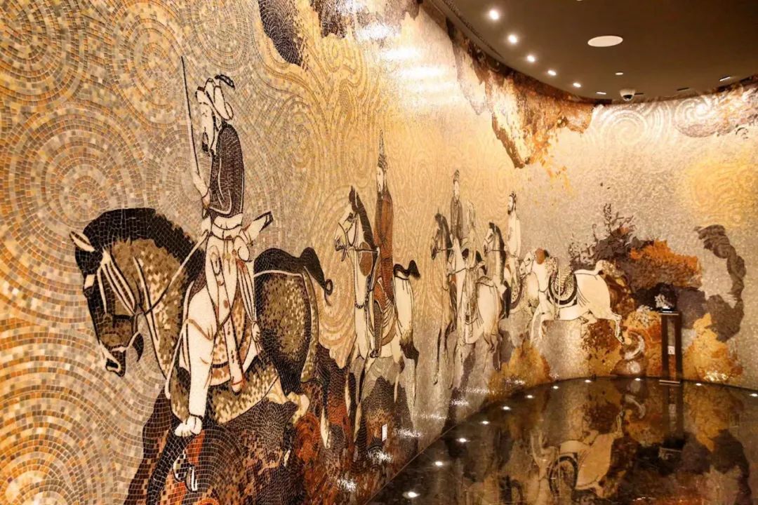 進入120層的“天之錦”餐廳。首先映入眼簾的是一幅長達 30 米,用幾十種不同材質(zhì)的意大利馬賽克鑲嵌的壁畫,呈現(xiàn)出古代絲綢之路的繁榮景象,述說著國強民富的時代企盼。