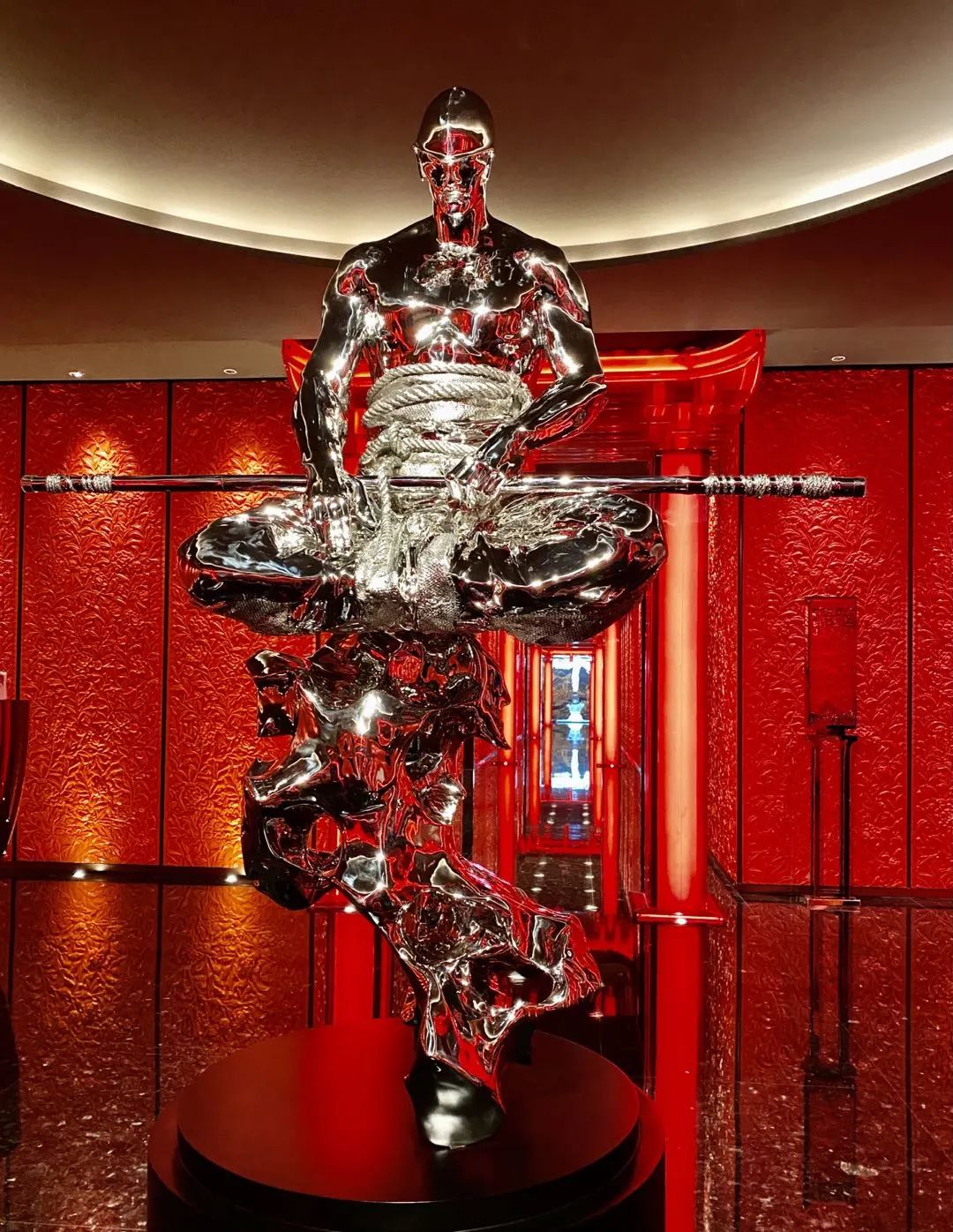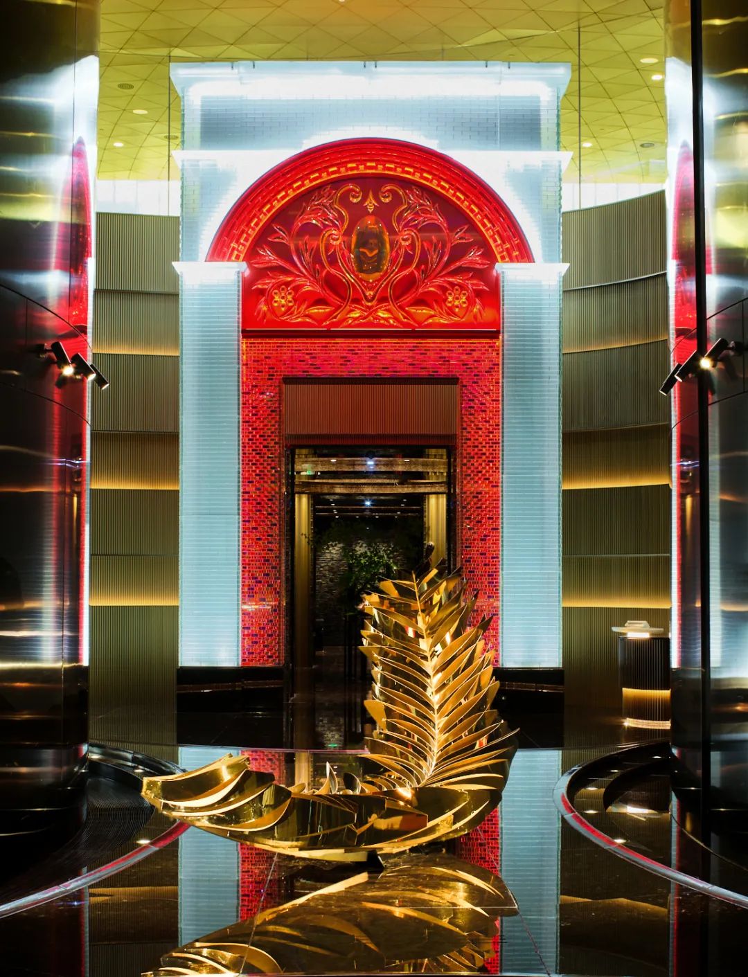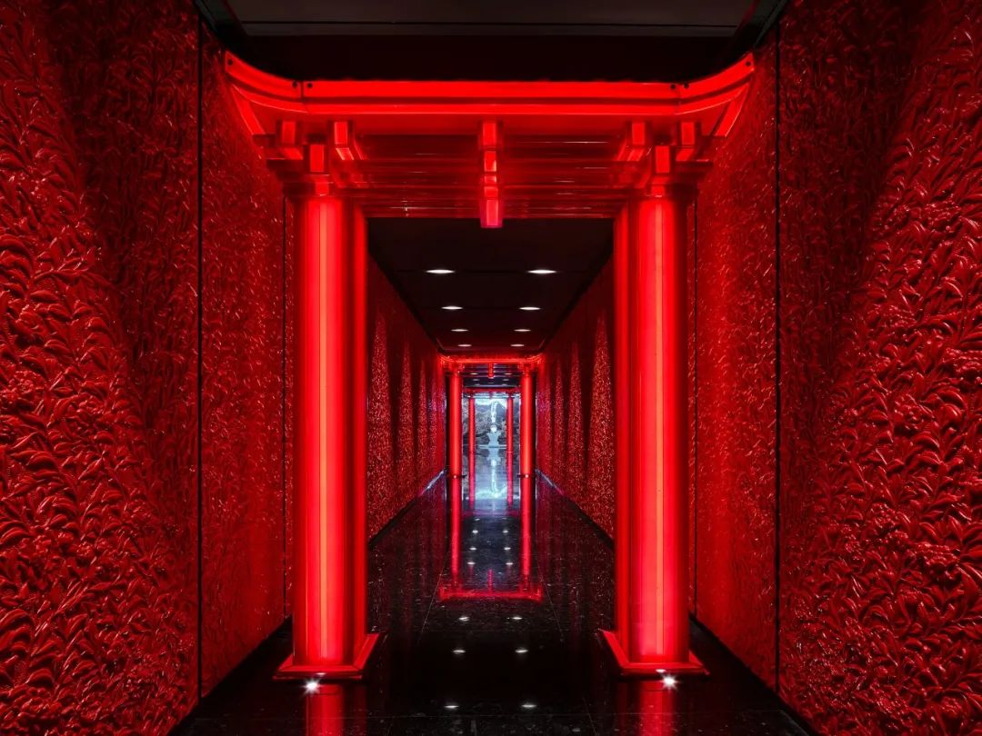 一尊造型頗具東方美的雕塑惹人注目,背景墻由紅色琉璃燒制而成的繁花雕紋,構成一條長廊,中國的傳統(tǒng)工藝之美盡顯。