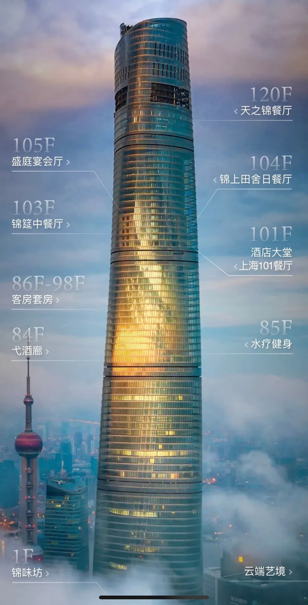 酒店共擁有7家餐廳及行政酒廊,其中,位于酒店120層的“天之錦”餐廳作為全球最高餐廳,正在申請吉尼斯紀錄。