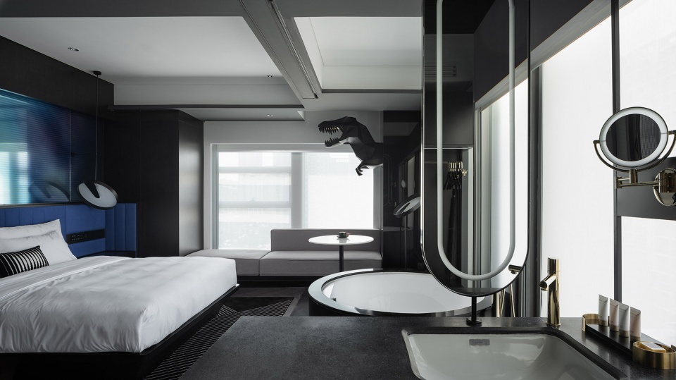 客房3內(nèi)部,以藍色為點綴,以恐龍雕塑為主題,設有開放式浴缸。