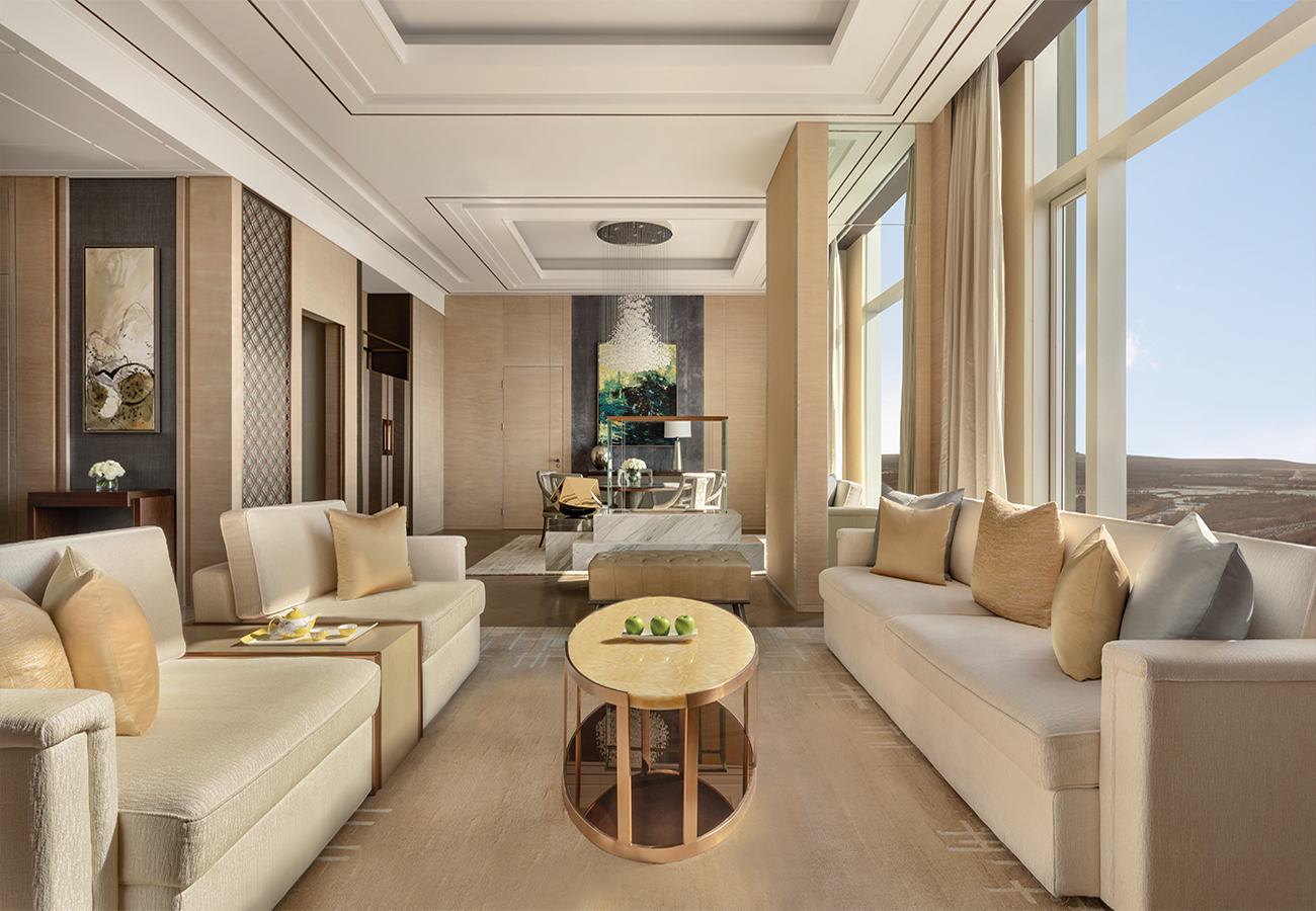 房間以寧靜色調(diào)為主,裝飾著典雅定制藝術(shù)品,寬敞的空間設(shè)有專門的工作或休閑空間??腿丝上碛每头棵阅惆蓛?nèi)的飲品。