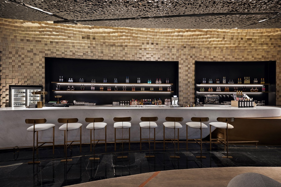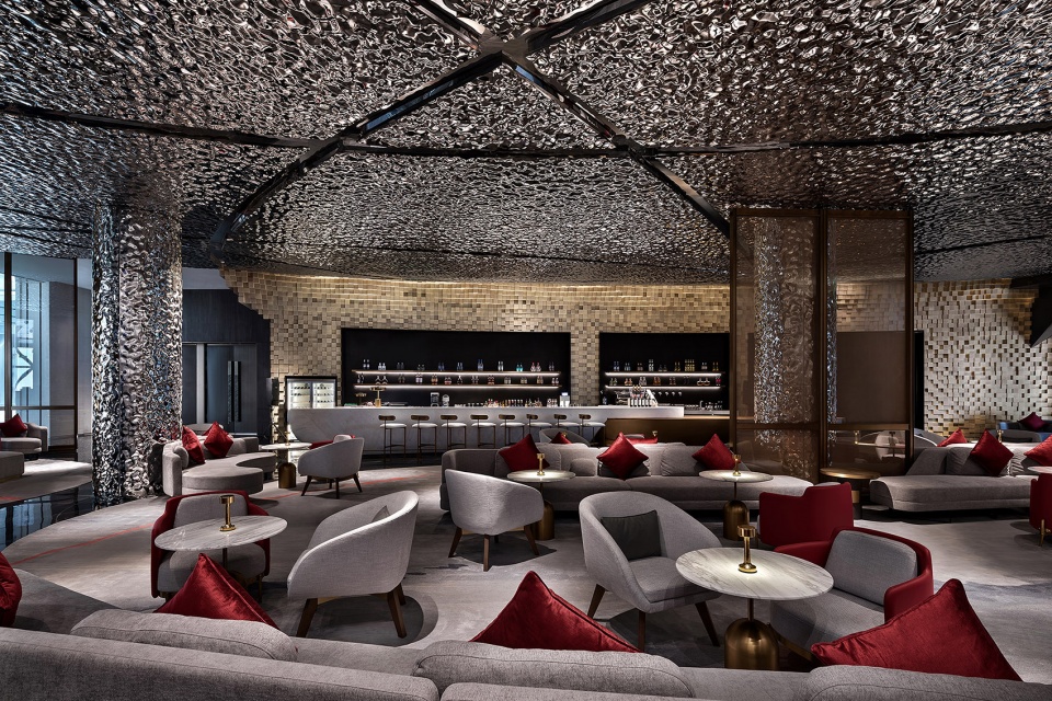 南京古城墻肌理被提取,化身大堂吧隔斷金屬結(jié)構(gòu),通透的設(shè)計(jì)使空間半隱半現(xiàn),既增強(qiáng)與大堂的聯(lián)動(dòng)性,又保證大堂吧的獨(dú)立性,將千年古都文化轉(zhuǎn)譯得更為時(shí)尚輕盈。