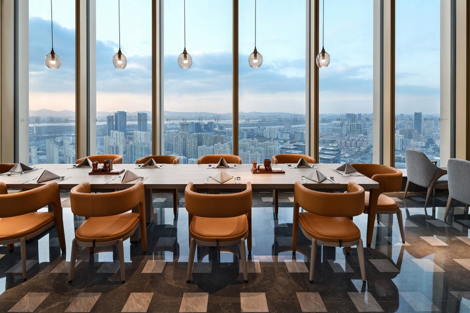 抵達(dá)位于塔樓連體層的空中大堂與大堂吧,登高望遠(yuǎn),壯懷激烈??臻g以極簡設(shè)計(jì)凝聚視覺焦點(diǎn),讓賓客立足城市巔峰,縱覽金陵勝景,奢享云端體驗(yàn)。