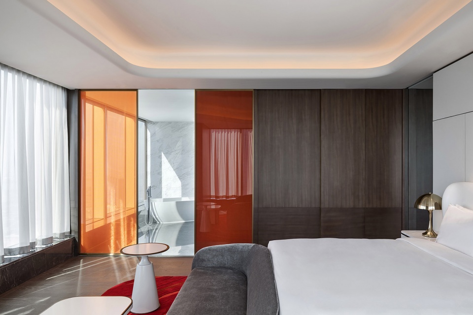 中餐包房中式燈具與西式皮椅的混搭設(shè)計(jì),將這種開放包容、兼收并蓄的精神融會(huì)貫通。深沉的天宇藍(lán)與熱烈的太陽紅在空間中激蕩,恰如這座城市過于與未來在此刻交匯。