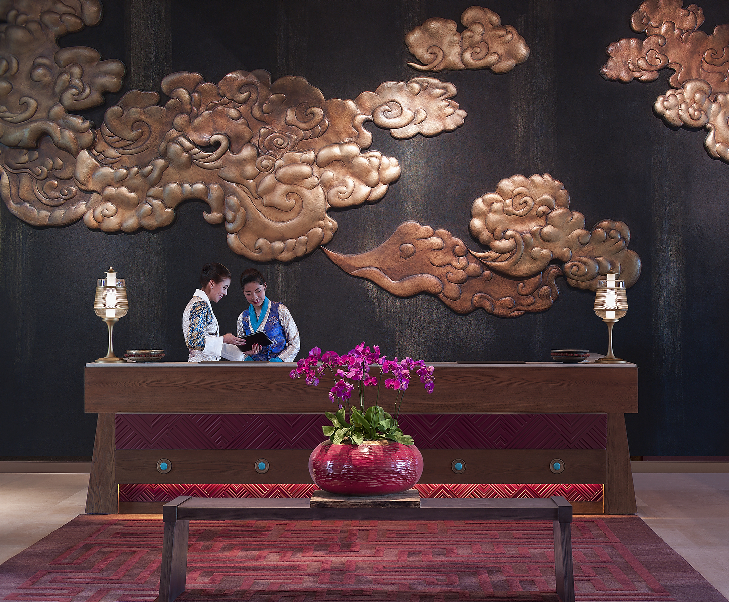 旅者酒廊被透明玻璃幕墻環(huán)繞,曼妙的水晶吊燈點亮整個空間,紅色織物與青銅細節(jié)以別樣符號詮釋西藏經(jīng)幡元素。