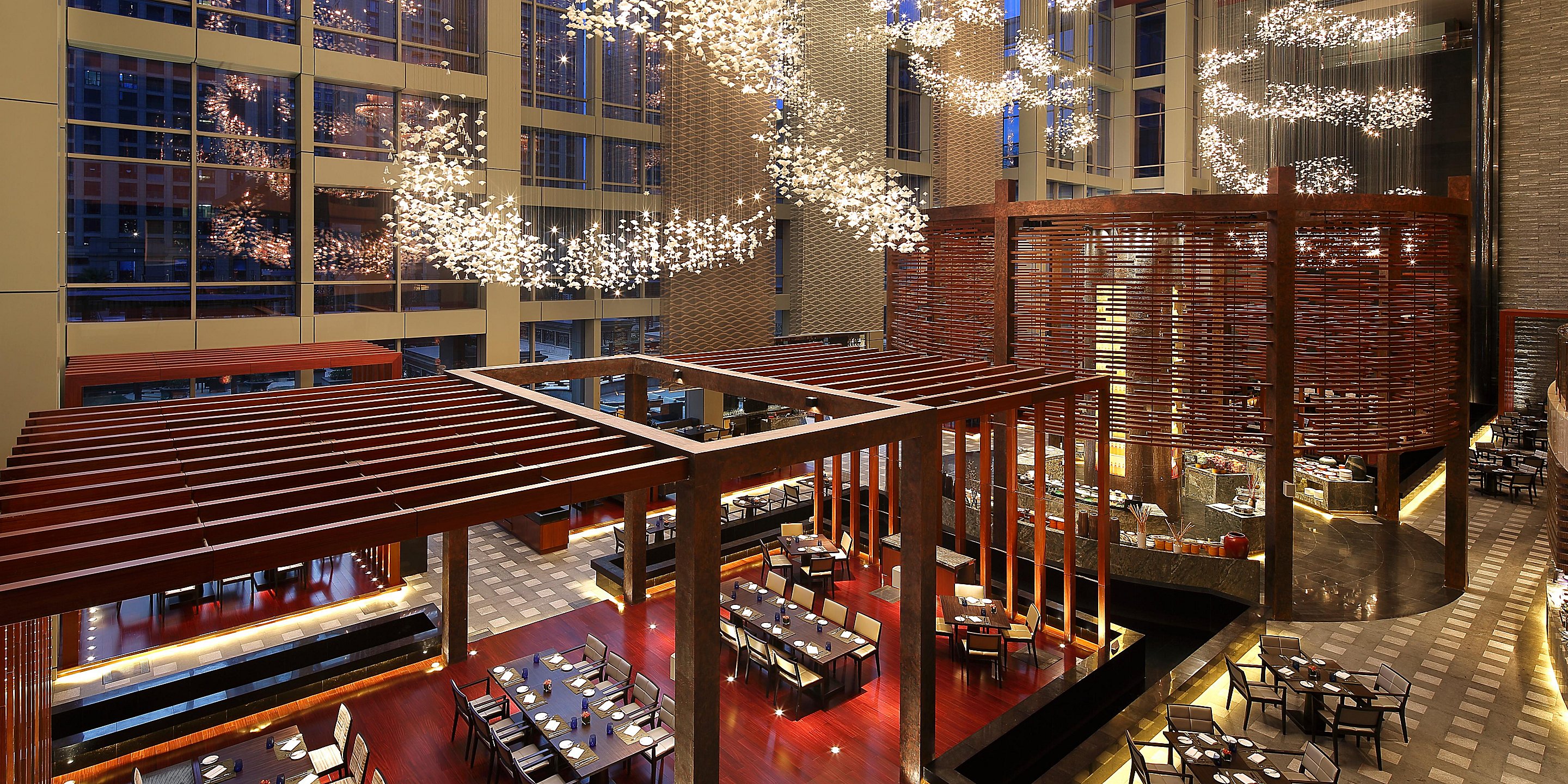 元素西餐廳位于酒店—層,屋頂挑高21米,寬敞明亮的空間,令人心曠神怡。