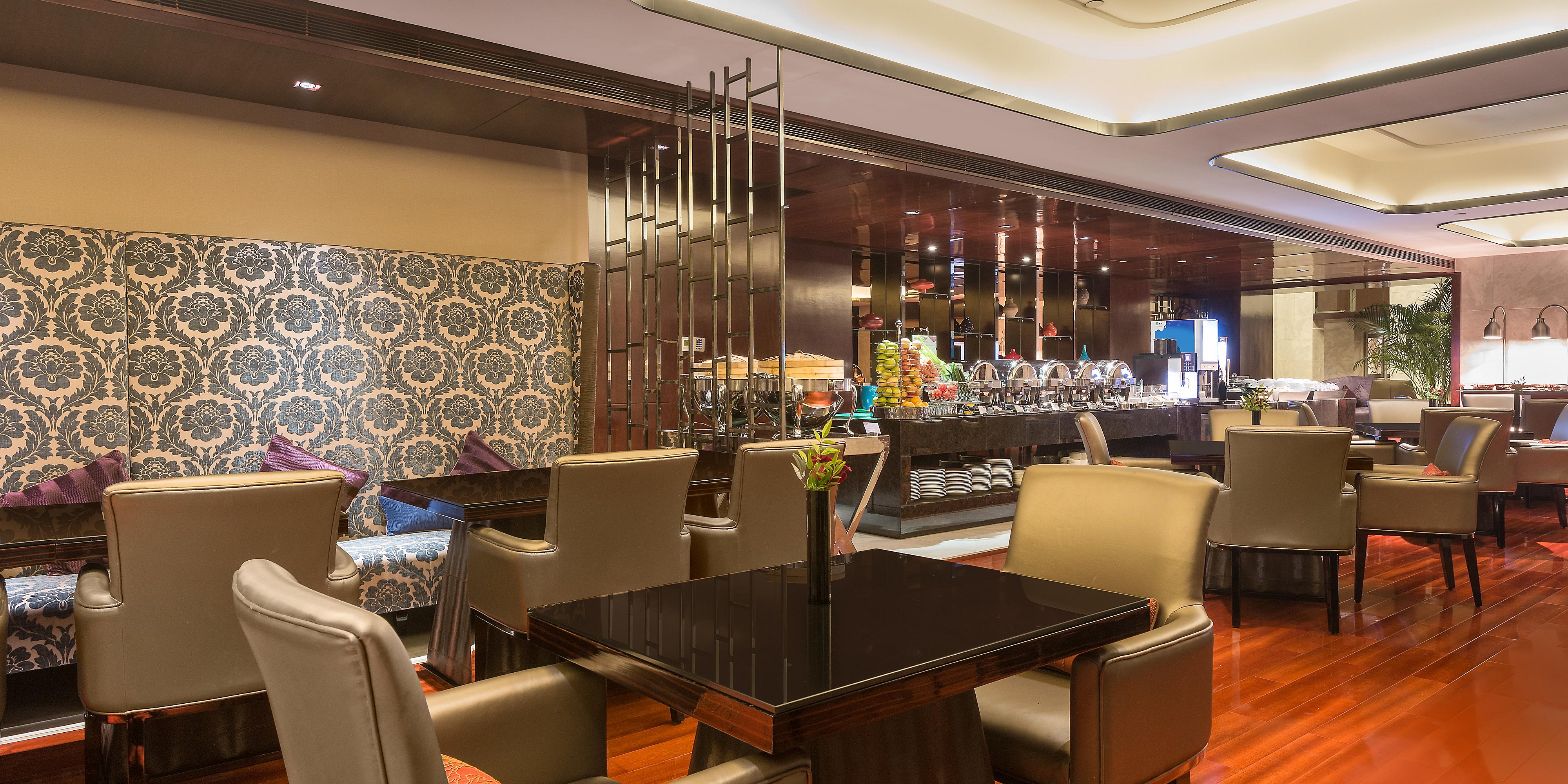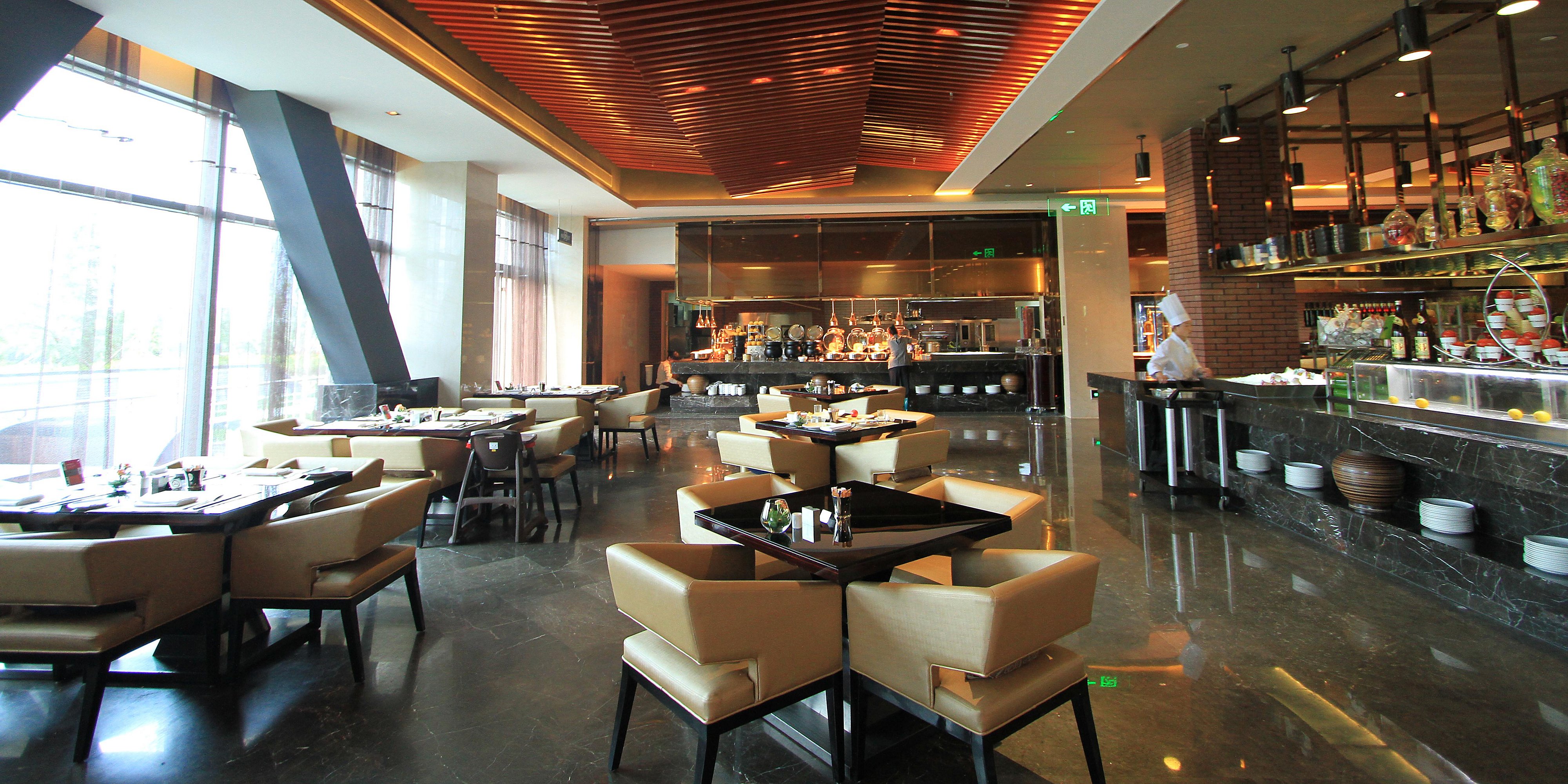 位于酒店一樓的河畔咖啡廳時尚雅致,設(shè)有182個餐位,提供環(huán)球自助美食,而且隨時為您用心烹制品種多樣的特色零點(diǎn)。