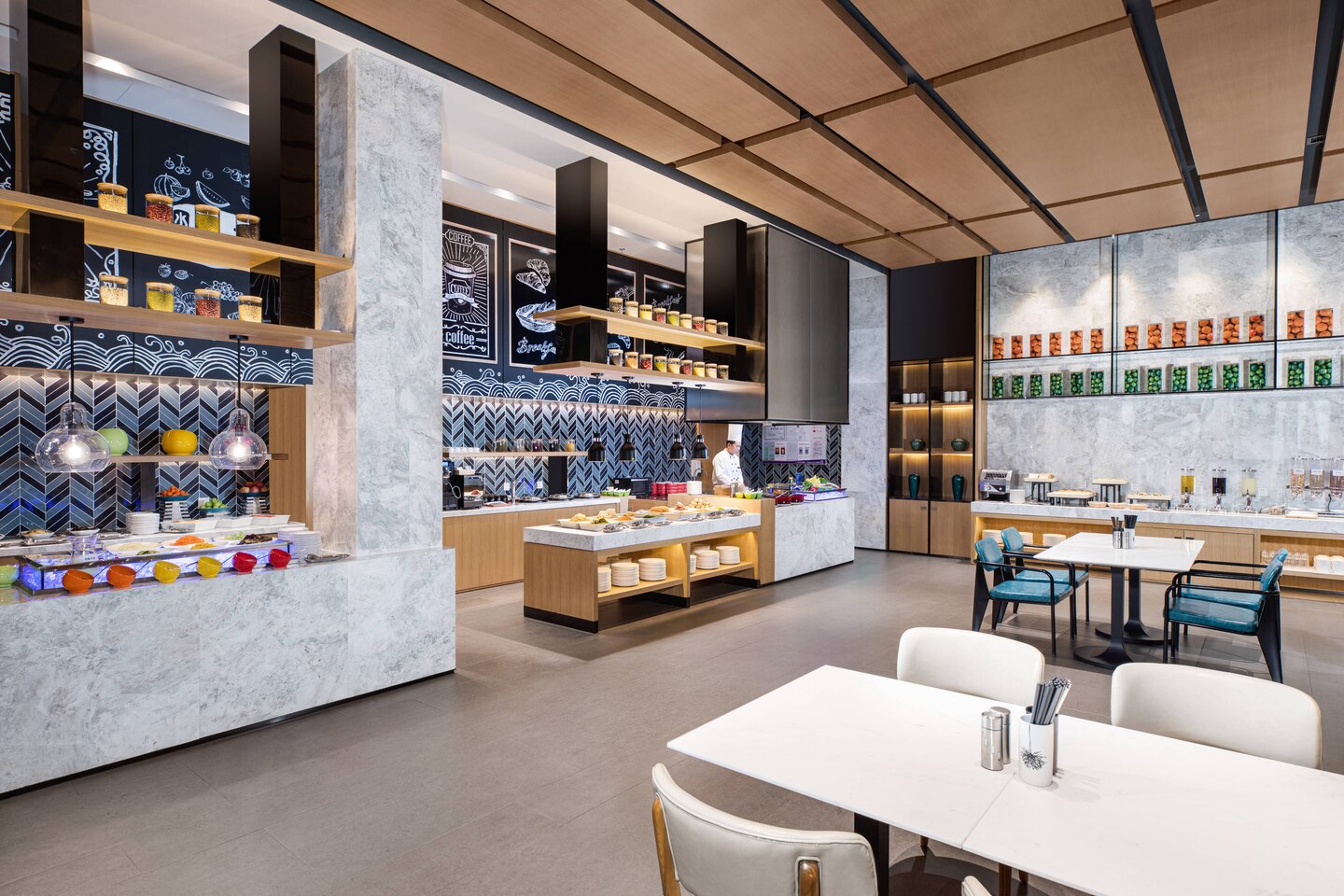 萬楓早餐廳為住店賓客提供 58 種豐盛的可口美食,包括果汁、新鮮水果、熱菜和中式面條