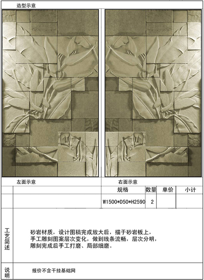 浮雕是雕刻的一種,雕刻者在一塊平板上將他要塑造的形象雕刻出來,使它脫離原來材料的平面。浮雕是雕塑與繪畫結合的產物,用壓縮的辦法來處理對象,靠透視等因素來表現(xiàn)三維空間,并只供一面或兩面觀看。酒店浮雕,是運用在酒店空間里的酒店軟裝產品。