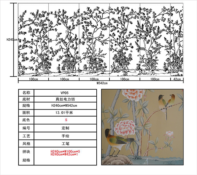 中式手繪墻紙繪畫的風格偏向于傳統(tǒng)工筆繪畫,兼帶現(xiàn)代繪畫的技法。典型的中式風格的手繪墻紙畫疏密對比強烈,虛實關(guān)系明顯,構(gòu)圖多采用近濃遠淡,近實遠虛的技法,來分清前后關(guān)系層層推遠畫面。繪畫技法也是多運用層層疊加的方式讓畫面色彩豐富渾厚華滋。