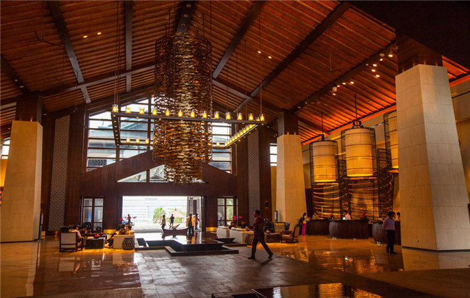 海棠灣9號(hào)凱萊酒店位于海南省三亞市林旺鎮(zhèn),酒店270度觀海,風(fēng)景迷人;酒店大堂古樸典雅;大堂藝術(shù)裝置設(shè)計(jì)了4組皮編屏風(fēng)格外引人注目。主屏風(fēng)長(zhǎng)7米高5.5米;另外三件長(zhǎng)4米高5.5米,陳設(shè)于服務(wù)臺(tái)后部。整個(gè)酒店裝飾屏風(fēng)以流暢的波浪線寓意大海的水紋,屏風(fēng)的金屬龍骨做雅黑色漆,外部純牛皮編制,每一個(gè)細(xì)節(jié)無可挑剔。